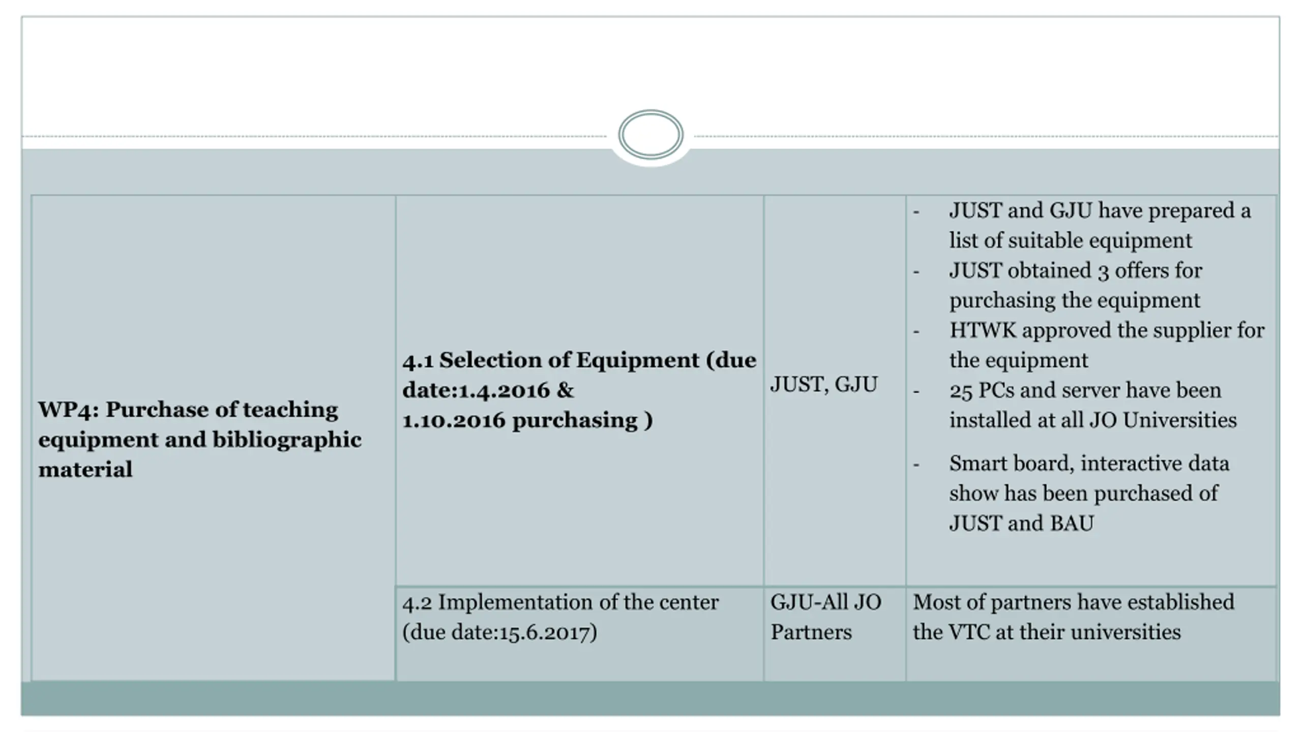 JUST and GJU have prepared a list of suitable equipment JUST obtained 3 offers for purchasing the equipment HTWK approved the supplier for the equipment 25 PCs and server have been installed at all JO Universities - - - 4.1 Selection of Equipment (due date:1.4.2016 & 1.10.2016 purchasing ) JUST, GJU - WP4: Purchase of teaching equipment and bibliographic material Smart board, interactive data show has been purchased of JUST and BAU - 4.2 Implementation of the center (due date:15.6.2017) GJU-All JO Partners Most of partners have established the VTC at their universities