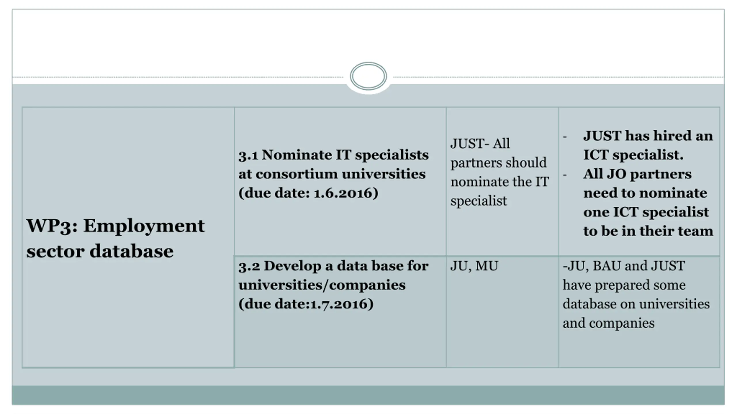 JUST has hired an ICT specialist. All JO partners need to nominate one ICT specialist to be in their team - JUST- All partners should nominate the IT specialist 3.1 Nominate IT specialists at consortium universities (due date: 1.6.2016) - WP3: Employment sector database 3.2 Develop a data base for universities/companies (due date:1.7.2016) JU, MU -JU, BAU and JUST have prepared some database on universities and companies