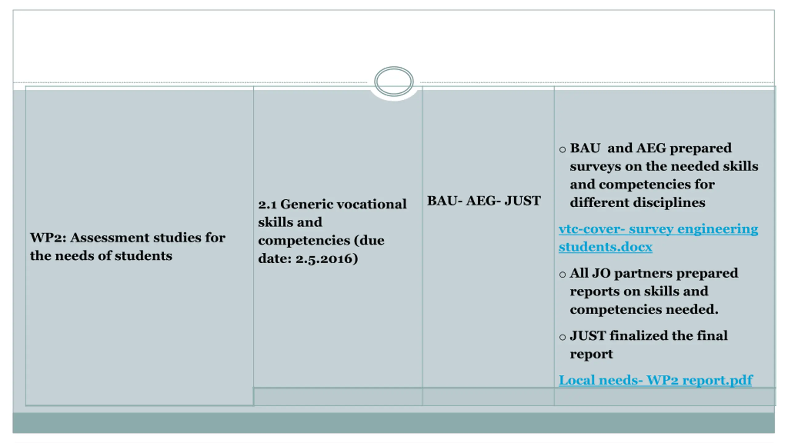 o BAU and AEG prepared surveys on the needed skills and competencies for different disciplines BAU- AEG- JUST 2.1 Generic vocational skills and competencies (due date: 2.5.2016) vtc-cover- survey engineering students.docx WP2: Assessment studies for the needs of students o All JO partners prepared reports on skills and competencies needed. o JUST finalized the final report Local needs- WP2 report.pdf