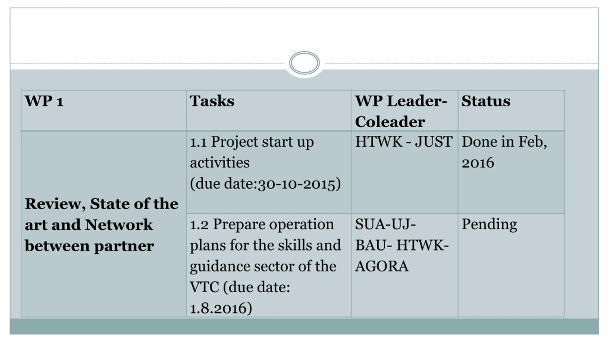 WP 1 Tasks WP Leader- Coleader HTWK - JUST Done in Feb, Status 1.1 Project start up activities (due date:30-10-2015) 2016 Review, State of the art and Network between partner 1.2 Prepare operation plans for the skills and guidance sector of the VTC (due date: 1.8.2016) SUA-UJ- BAU- HTWK- AGORA Pending