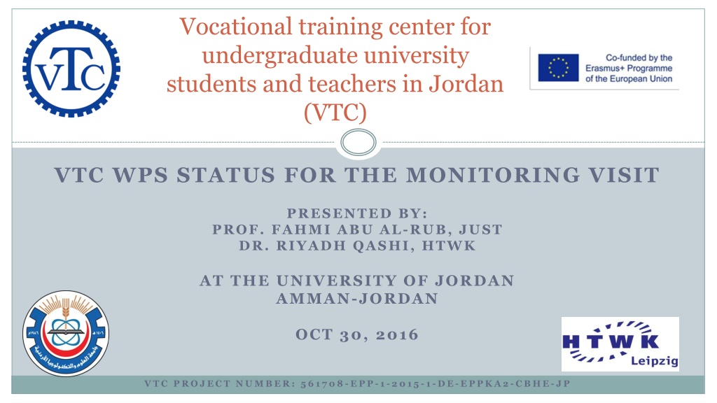 Vocational training center for undergraduate university students and teachers in Jordan (VTC) VTC WPS STATUS FOR THE MONITORING VISIT PRESENTED BY: PROF. FAHMI ABU AL-RUB, JUST DR. RIYADH QASHI, HTWK AT THE UNIVERSITY OF JORDAN AMMAN-JORDAN OCT 30, 2016 V T C P R O J E C T N U M B E R : 5 6 1 7 0 8 - E P P - 1 - 2 01 5 - 1 - D E - E PP K A 2 - C B H E - J P