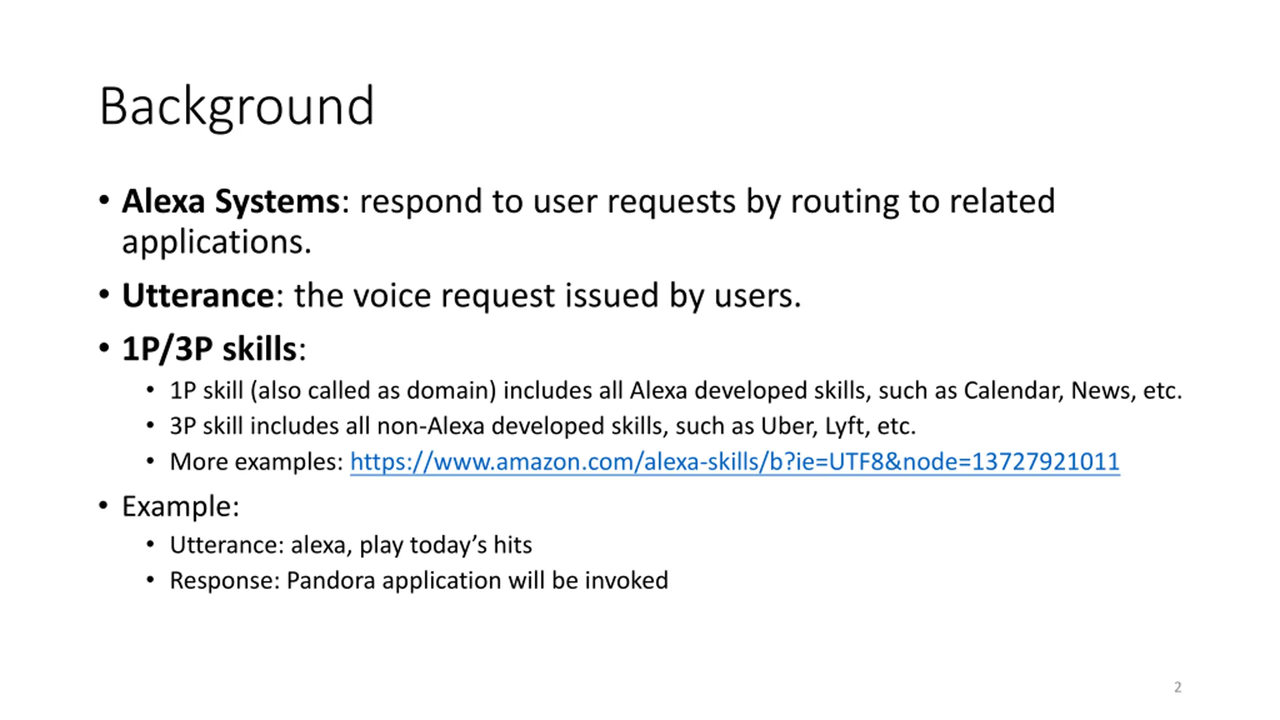 Background Alexa Systems: respond to user requests by routing to related applications. Utterance: the voice request issued by users. 1P/3P skills: 1P skill (also called as domain) includes all Alexa developed skills, such as Calendar, News, etc. 3P skill includes all non-Alexa developed skills, such as Uber, Lyft, etc. More examples: https://www.amazon.com/alexa-skills/b?ie=UTF8&node=13727921011 Example: Utterance: alexa, play today s hits Response: Pandora application will be invoked 2