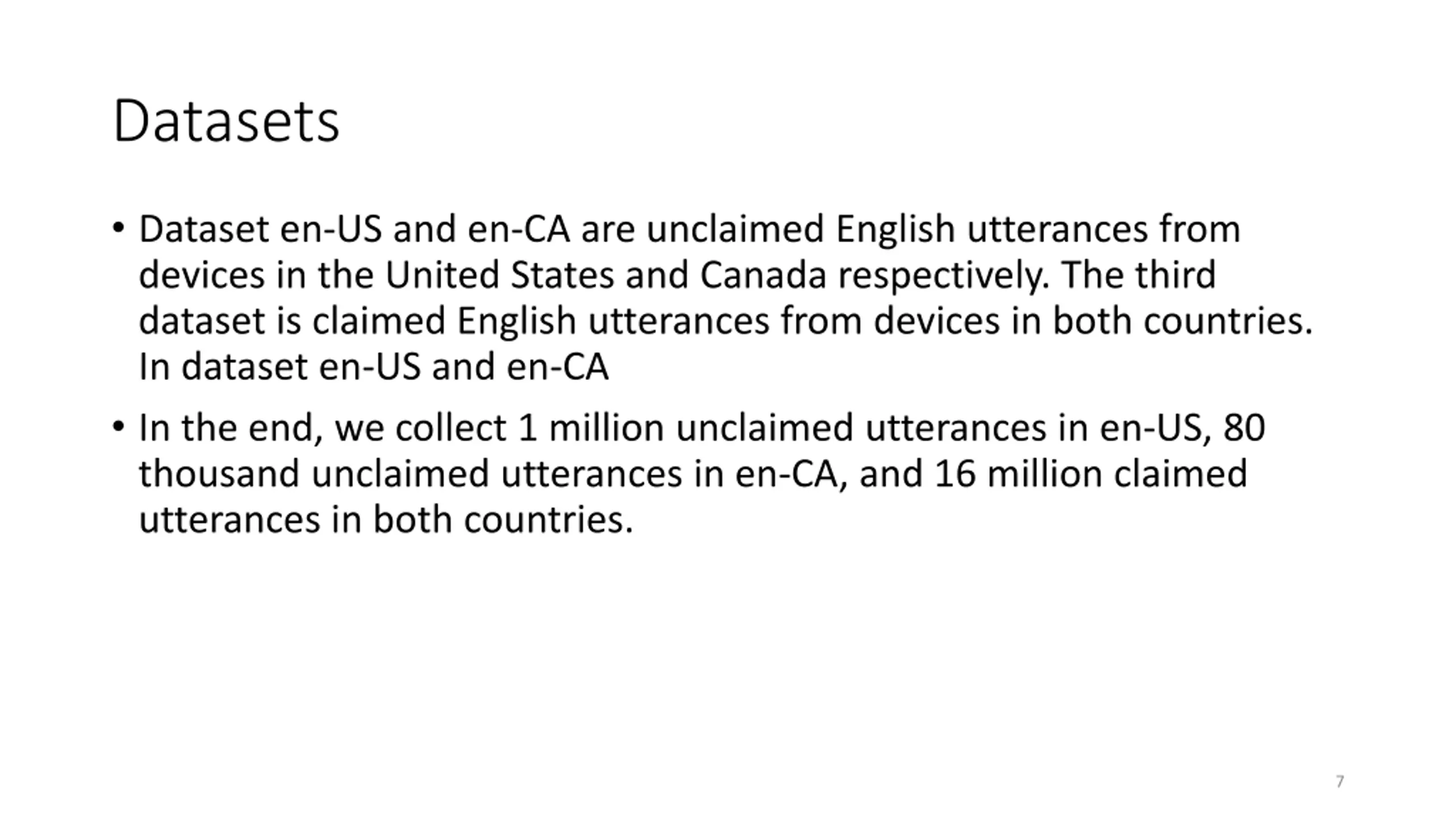 Datasets Dataset en-US and en-CA are unclaimed English utterances from devices in the United States and Canada respectively. The third dataset is claimed English utterances from devices in both countries. In dataset en-US and en-CA In the end, we collect 1 million unclaimed utterances in en-US, 80 thousand unclaimed utterances in en-CA, and 16 million claimed utterances in both countries. 7