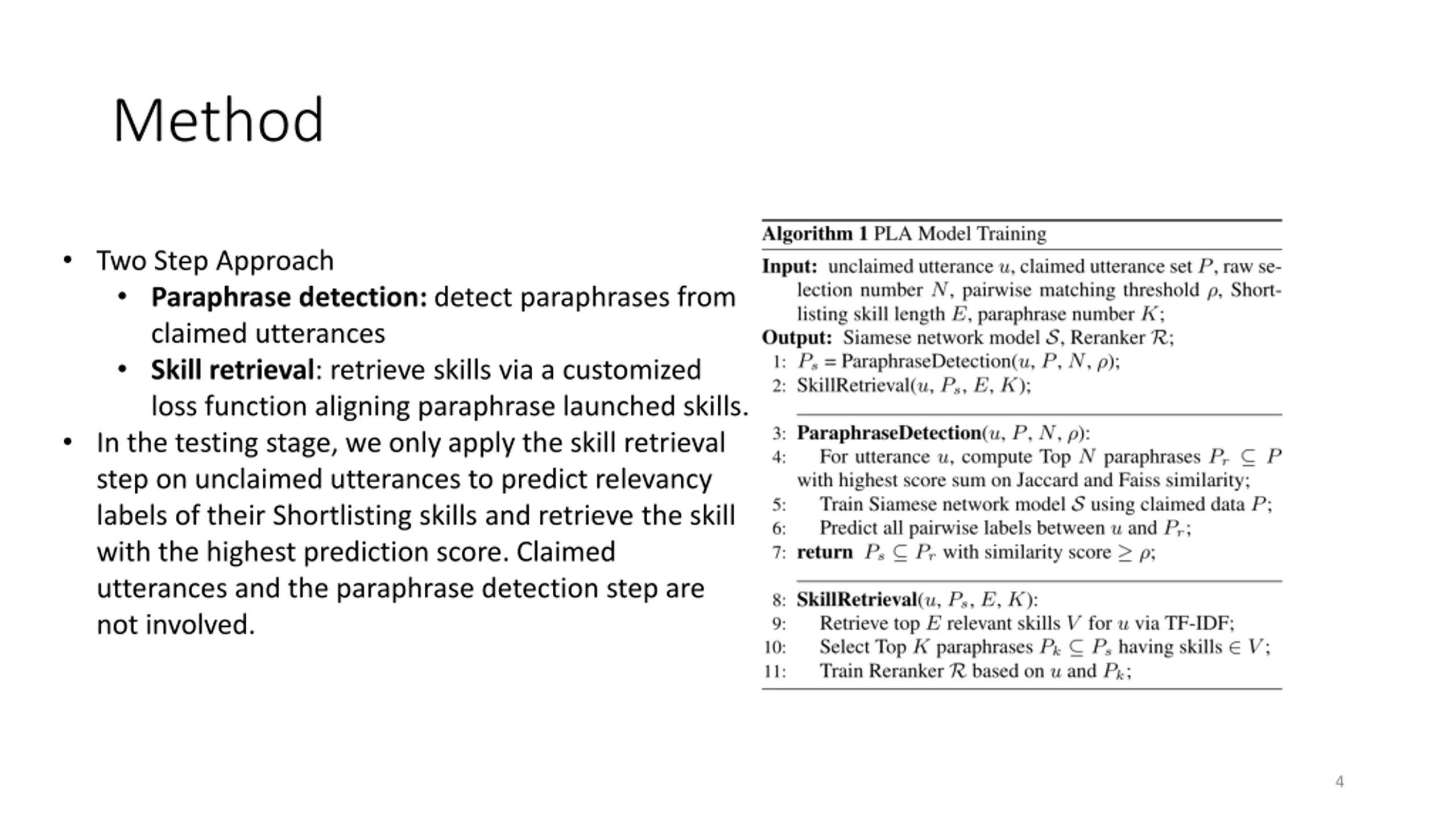 Method Two Step Approach Paraphrase detection: detect paraphrases from claimed utterances Skill retrieval: retrieve skills via a customized loss function aligning paraphrase launched skills. In the testing stage, we only apply the skill retrieval step on unclaimed utterances to predict relevancy labels of their Shortlisting skills and retrieve the skill with the highest prediction score. Claimed utterances and the paraphrase detection step are not involved. 4