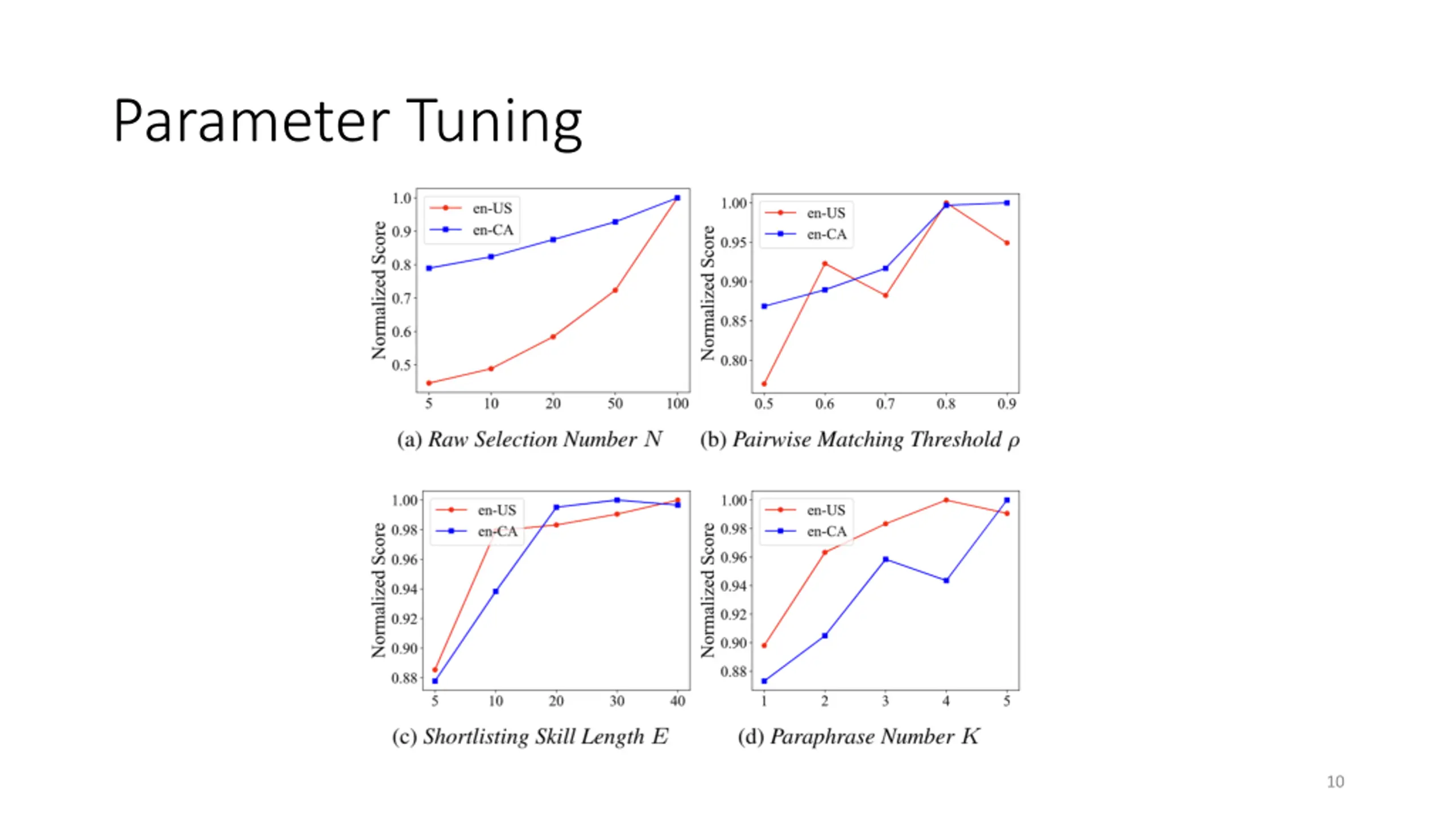 Skill Retrieval Evaluation Model Variants: TF-IDF Listwise Listwise + PL (paraphrase labels) Listwise + Co (combined claimed and unclaimed training data) Faiss + JS + SR (truncated model with Faiss model + Jaccard similarity + skill retrieval step) Siamese + SR (truncated model with Siamese network and skill retrieval step ) Evaluation Metrics: Precision, recall, F1 and NDCG 9