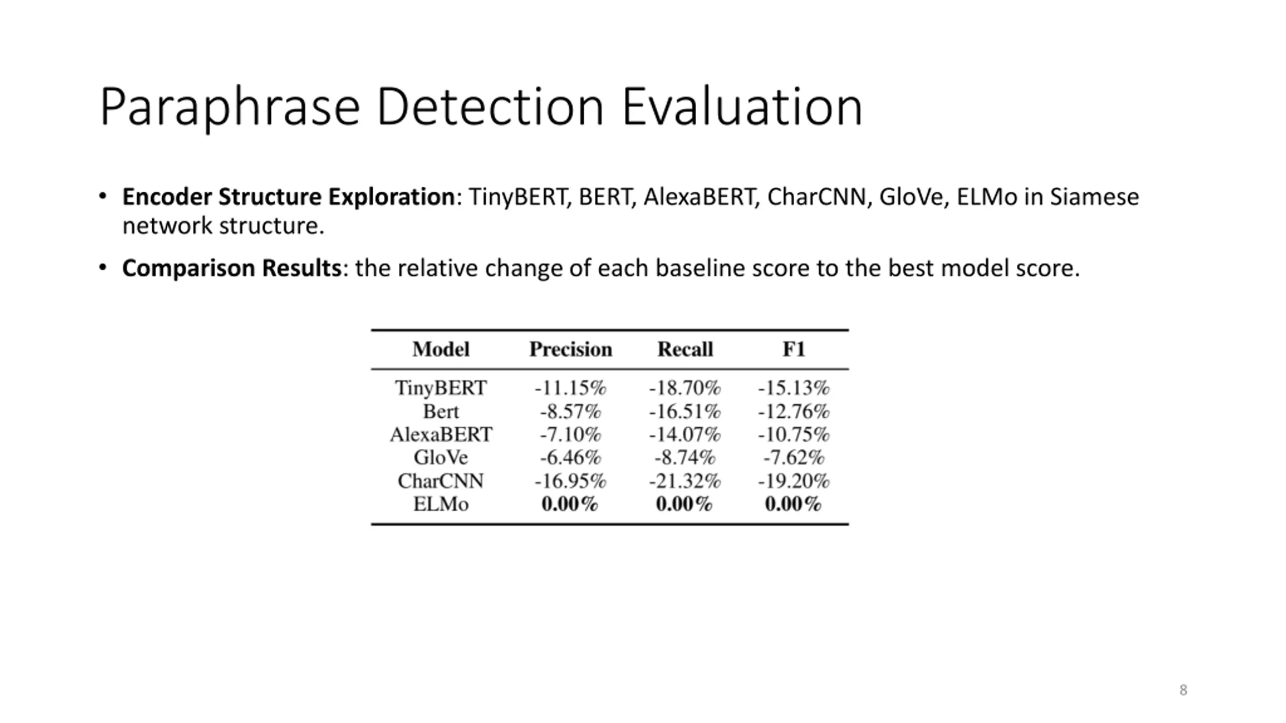 Paraphrase Detection Evaluation Encoder Structure Exploration: TinyBERT, BERT, AlexaBERT, CharCNN, GloVe, ELMo in Siamese network structure. Comparison Results: the relative change of each baseline score to the best model score. 8