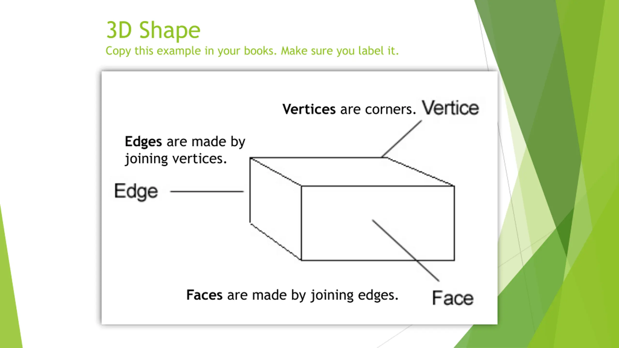 3D Shape Copy this example in your books. Make sure you label it. Vertices are corners. Edges are made by joining vertices. Faces are made by joining edges.
