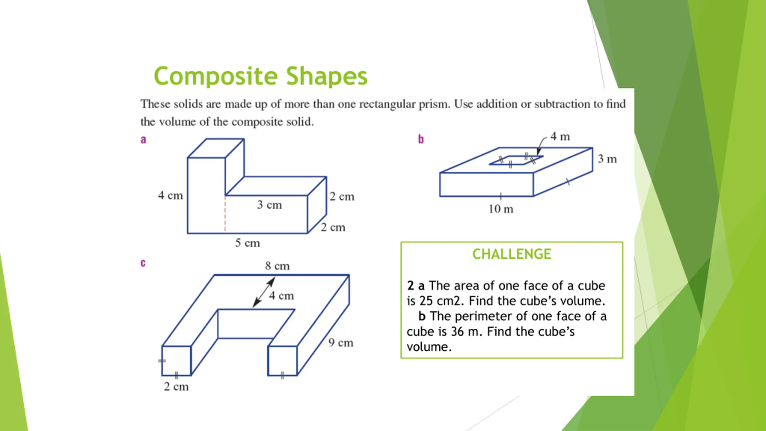 Composite Shapes Answers Composite Shapes a 28 cm3b 252 m3 c 104cm3 Challenge 2a 125 cm3 b 729 m3 CHALLENGE 2 a The area of one face of a cube is 25 cm2. Find the cube s volume. b The perimeter of one face of a cube is 36 m. Find the cube s volume.