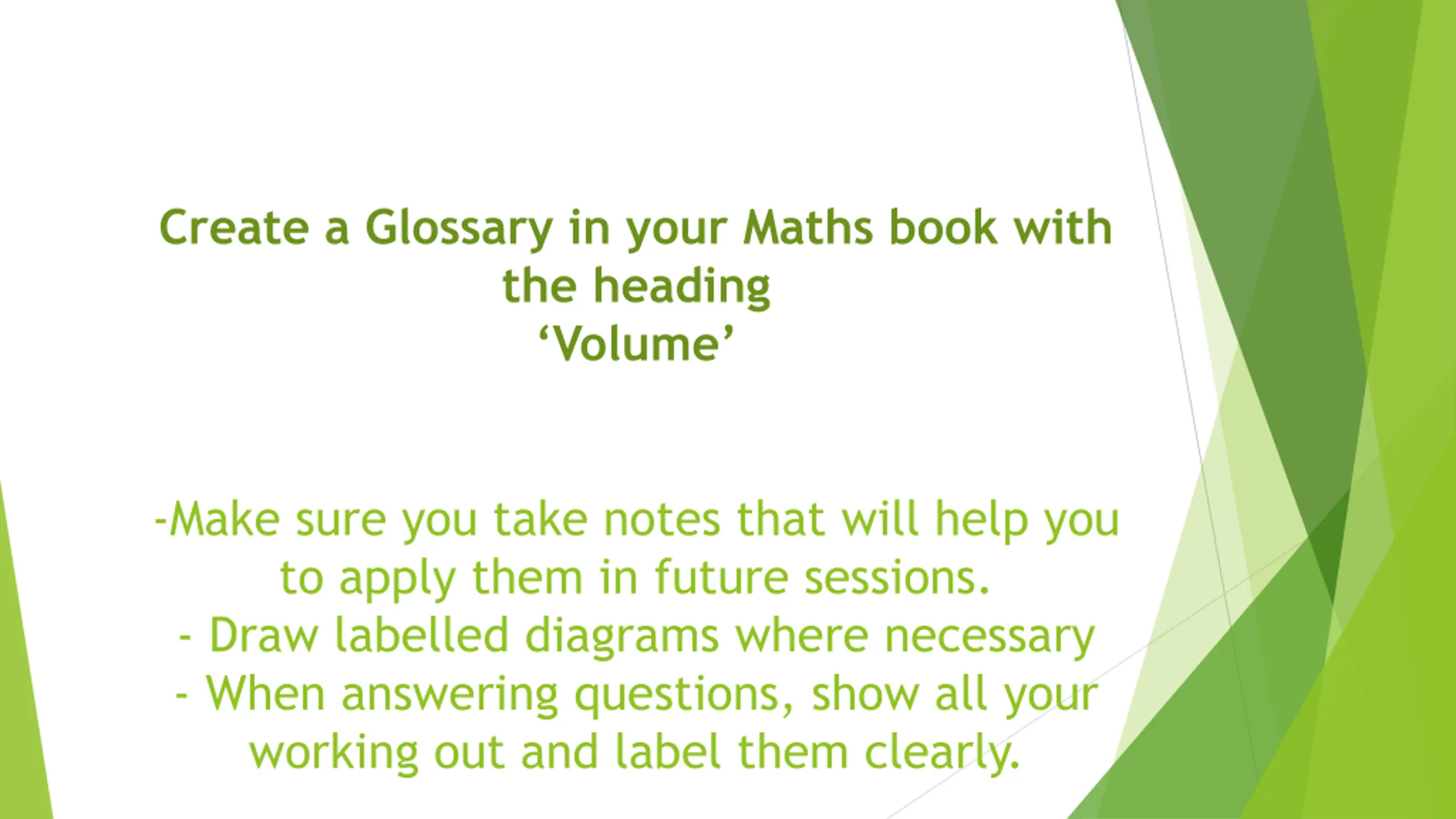 Create a Glossary in your Maths book with the heading Volume -Make sure you take notes that will help you to apply them in future sessions. - Draw labelled diagrams where necessary - When answering questions, show all your working out and label them clearly.