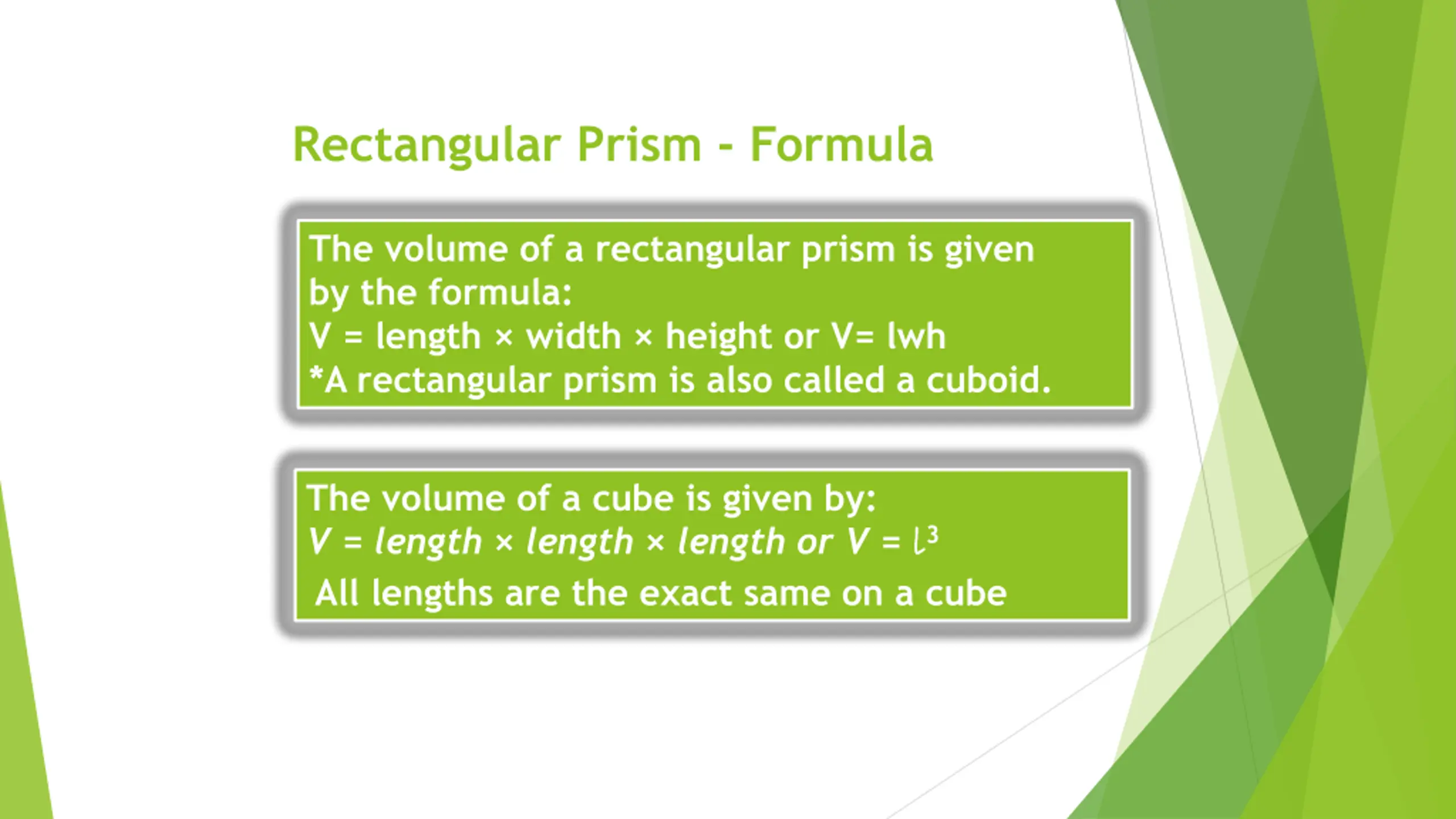 Rectangular Prism - Formula The volume of a rectangular prism is given by the formula: V = length width height or V= lwh *A rectangular prism is also called a cuboid. The volume of a cube is given by: V = length length length or V = l l3 All lengths are the exact same on a cube