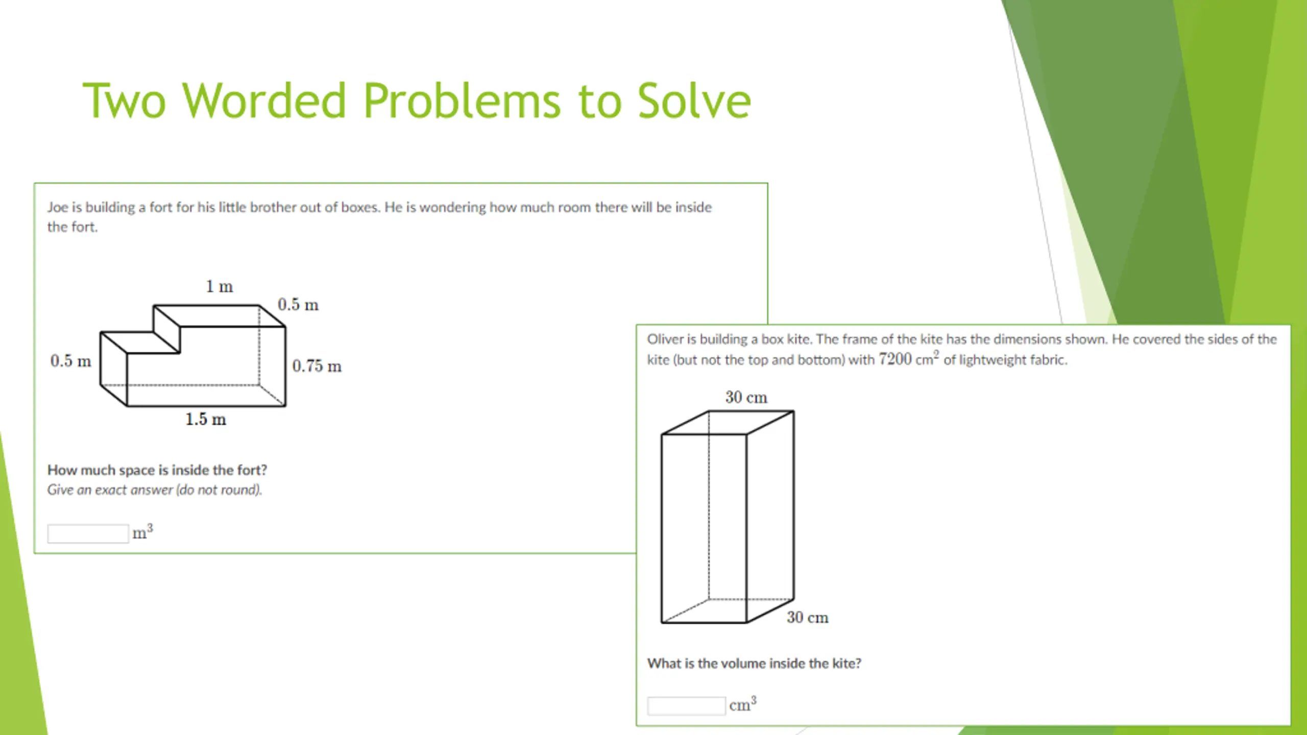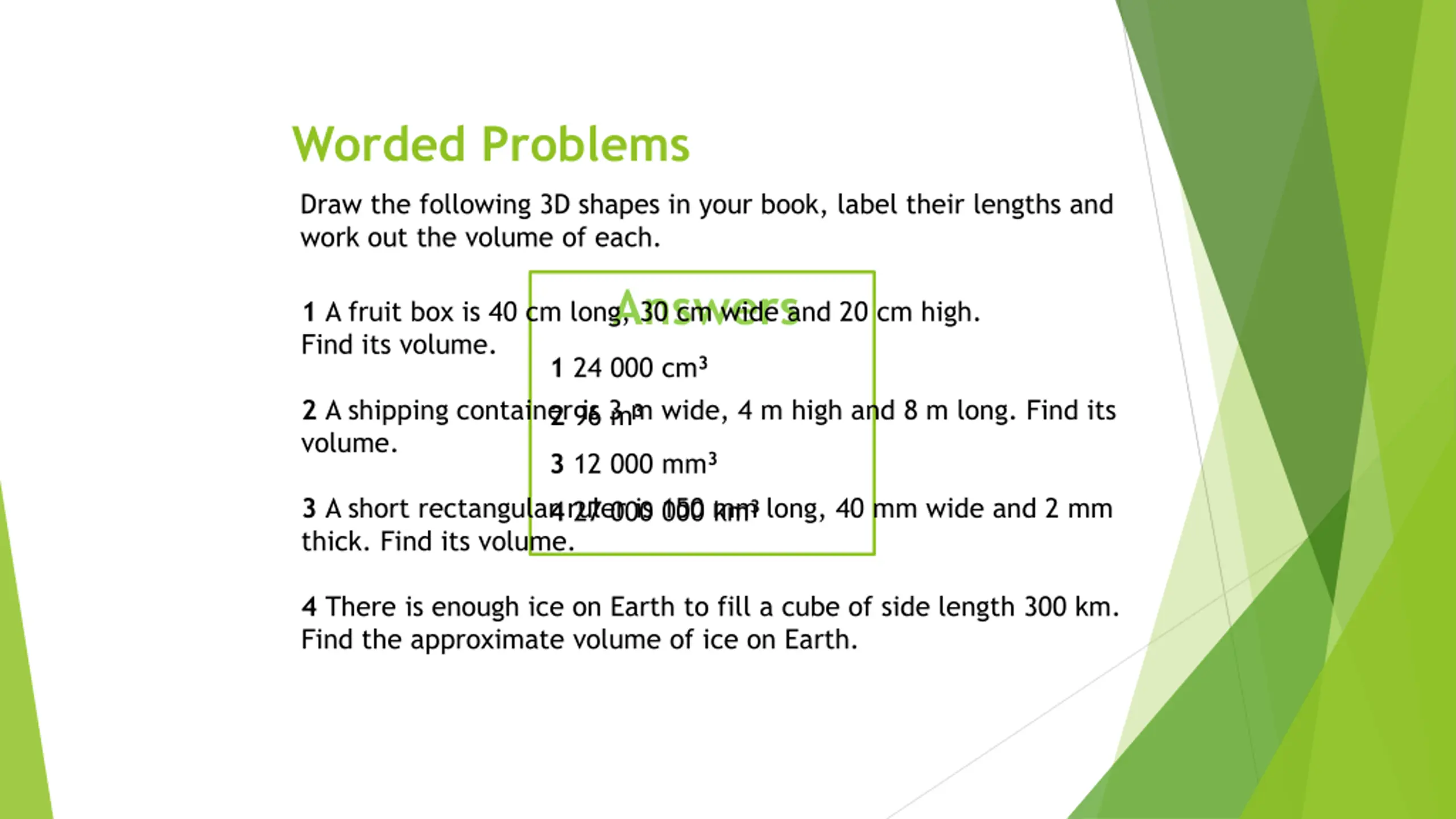 Worded Problems Draw the following 3D shapes in your book, label their lengths and work out the volume of each. Answers 1 A fruit box is 40 cm long, 30 cm wide and 20 cm high. Find its volume. 1 24 000 cm3 2 A shipping container is 3 m wide, 4 m high and 8 m long. Find its volume. 2 96 m3 3 12 000 mm3 3 A short rectangular ruler is 150 mm long, 40 mm wide and 2 mm thick. Find its volume. 4 27 000 000 km3 4 There is enough ice on Earth to fill a cube of side length 300 km. Find the approximate volume of ice on Earth.