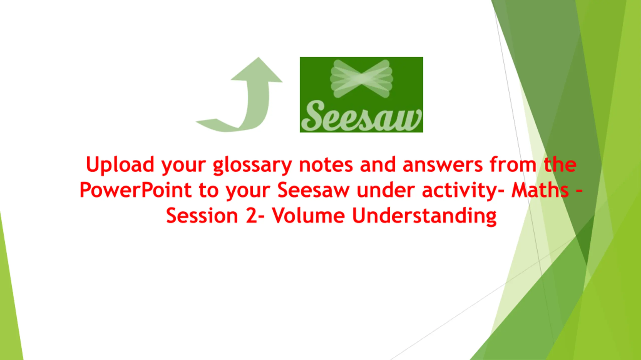 Upload your glossary notes and answers from the PowerPoint to your Seesaw under activity- Maths Session 2- Volume Understanding