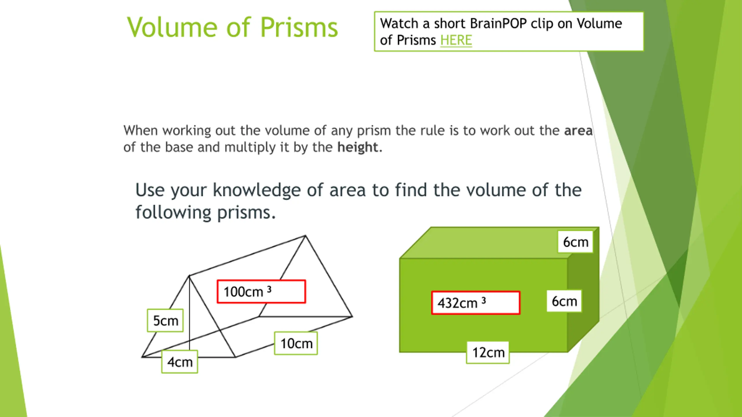 Volume of Prisms Watch a short BrainPOP clip on Volume of Prisms HERE When working out the volume of any prism the rule is to work out the area of the base and multiply it by the height. Use your knowledge of area to find the volume of the following prisms. 6cm 100cm 3 6cm 432cm 3 5cm 10cm 12cm 4cm