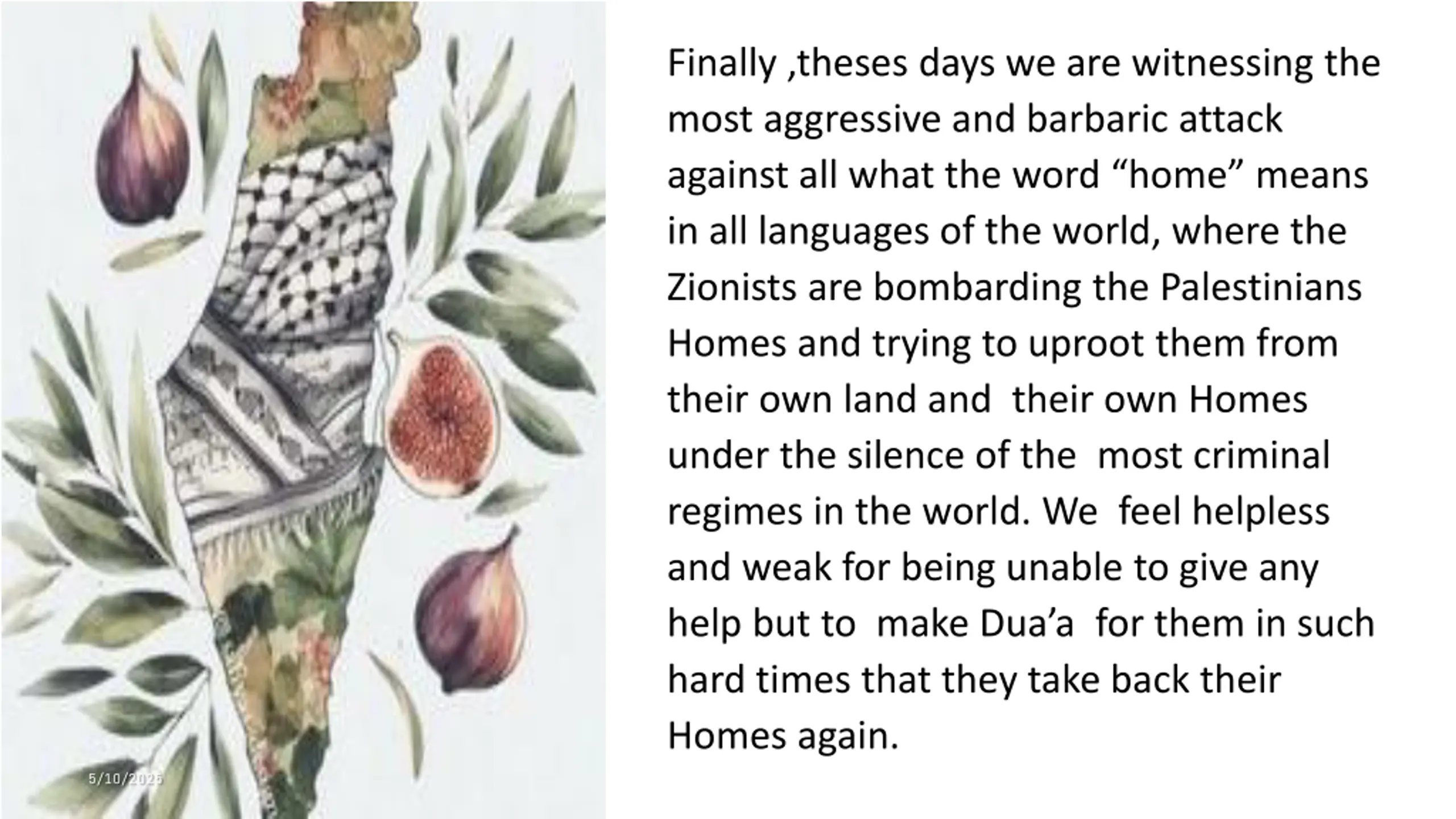 Finally ,theses days we are witnessing the most aggressive and barbaric attack against all what the word home means in all languages of the world, where the Zionists are bombarding the Palestinians Homes and trying to uproot them from their own land and their own Homes under the silence of the most criminal regimes in the world. We feel helpless and weak for being unable to give any help but to make Dua a for them in such hard times that they take back their Homes again. 5/10/2025 5/10/2025