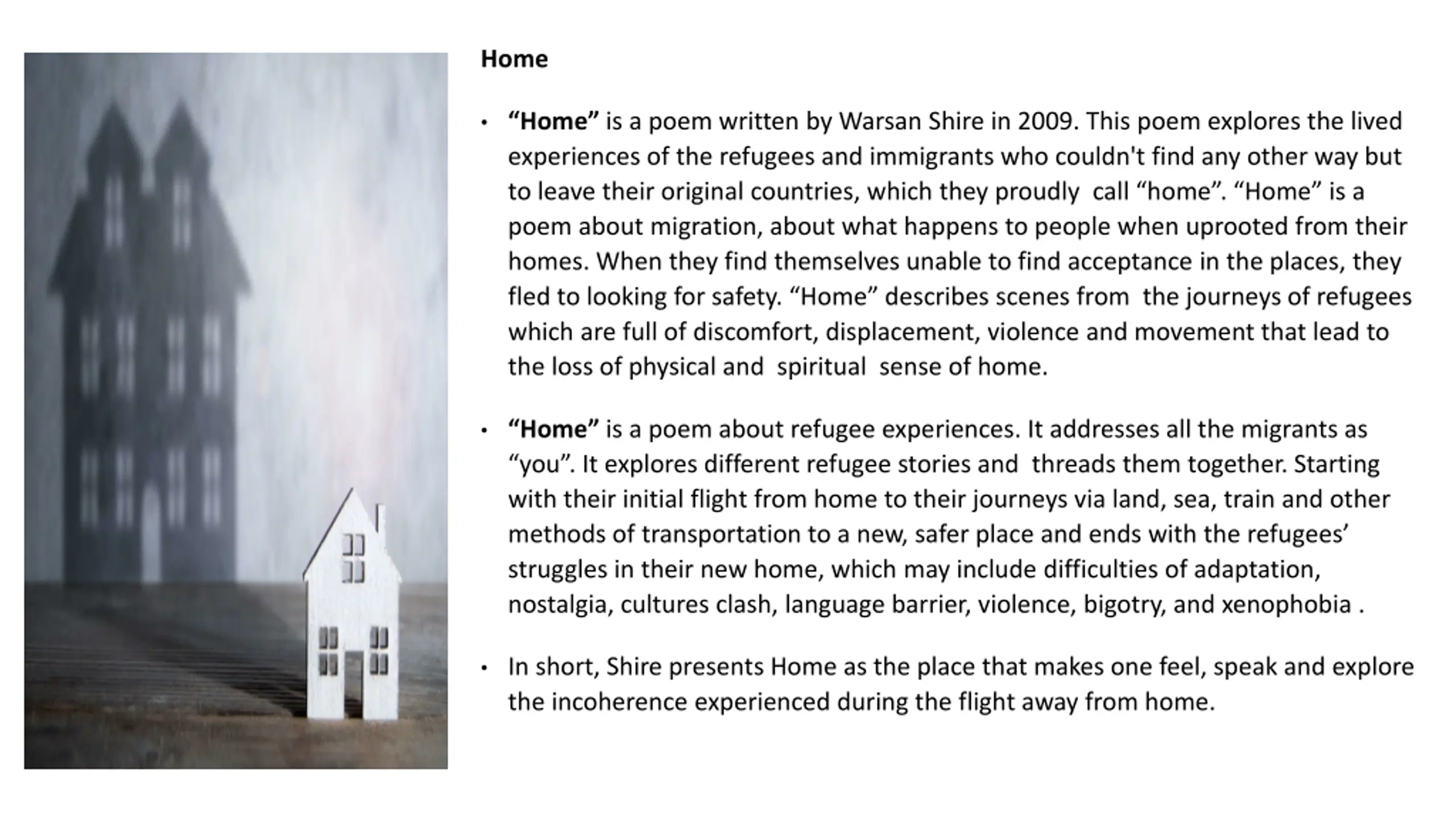 Home Home is a poem written by Warsan Shire in 2009. This poem explores the lived experiences of the refugees and immigrants who couldn't find any other way but to leave their original countries, which they proudly call home . Home is a poem about migration, about what happens to people when uprooted from their homes. When they find themselves unable to find acceptance in the places, they fled to looking for safety. Home describes scenes from the journeys of refugees which are full of discomfort, displacement, violence and movement that lead to the loss of physical and spiritual sense of home. Home is a poem about refugee experiences. It addresses all the migrants as you . It explores different refugee stories and threads them together. Starting with their initial flight from home to their journeys via land, sea, train and other methods of transportation to a new, safer place and ends with the refugees struggles in their new home, which may include difficulties of adaptation, nostalgia, cultures clash, language barrier, violence, bigotry, and xenophobia . In short, Shire presents Home as the place that makes one feel, speak and explore the incoherence experienced during the flight away from home.