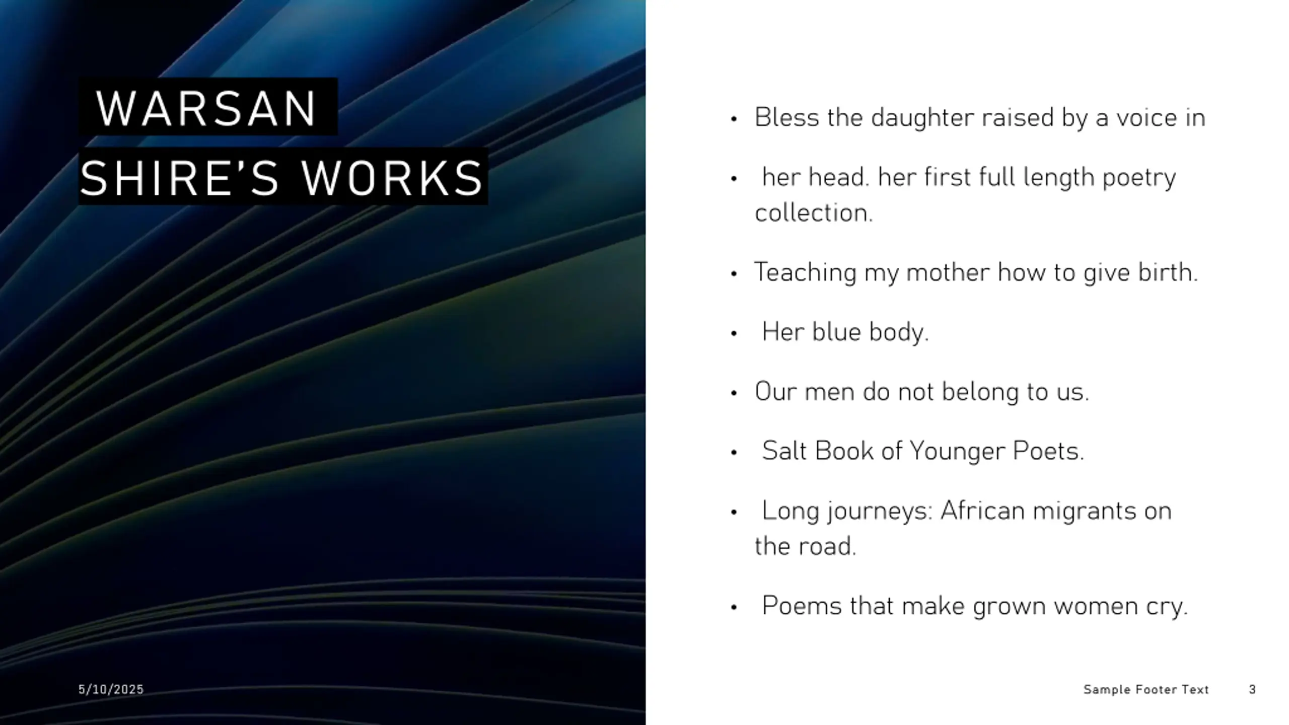 WARSAN SHIRE S WORKS Bless the daughter raised by a voice in her head. her first full length poetry collection. Teaching my mother how to give birth. Her blue body. Our men do not belong to us. Salt Book of Younger Poets. Long journeys: African migrants on the road. Poems that make grown women cry. 5/10/2025 5/10/2025 Sample Footer Text Sample Footer Text 3 3