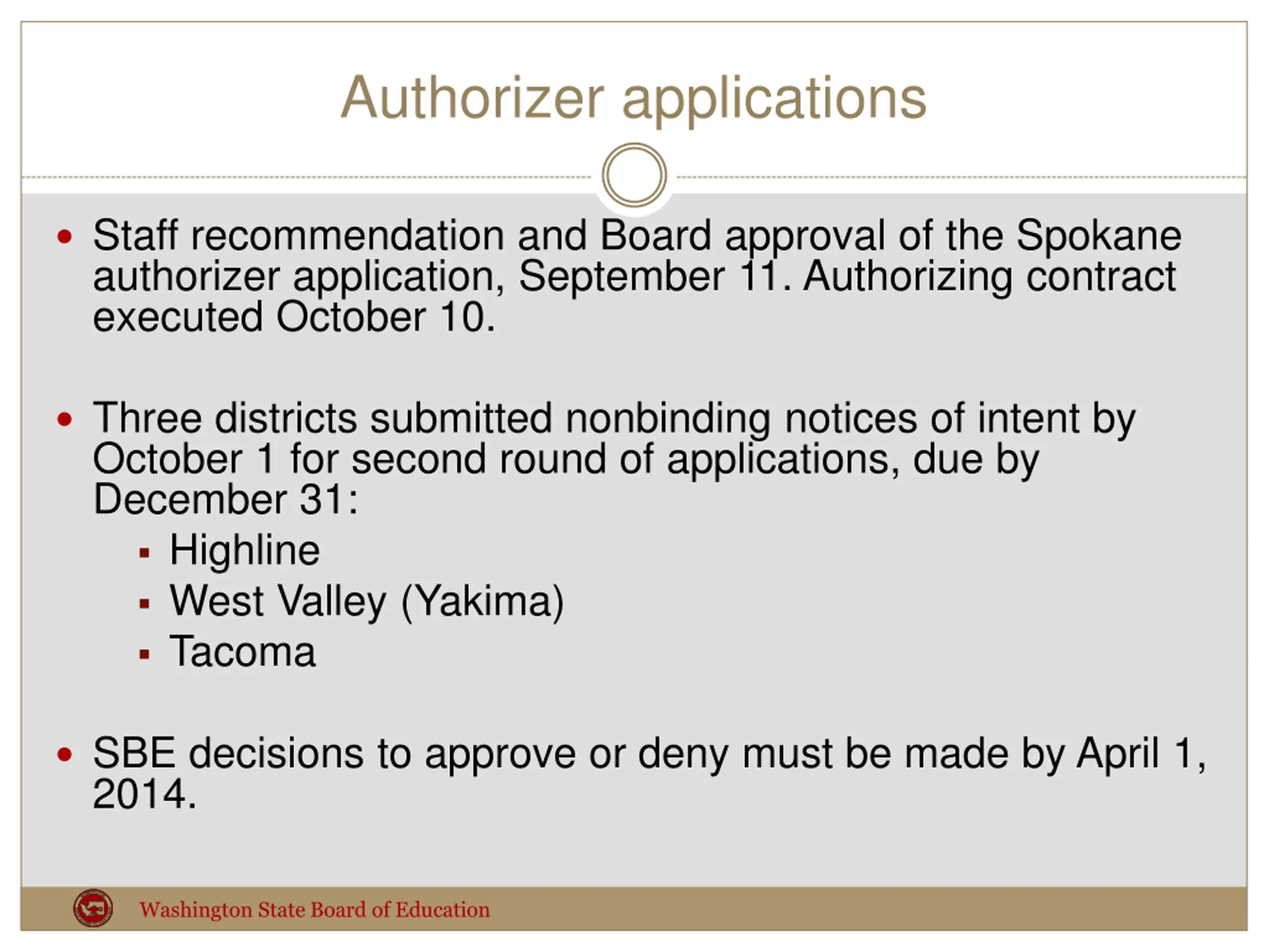Authorizer applications Staff recommendation and Board approval of the Spokane authorizer application, September 11. Authorizing contract executed October 10. Three districts submitted nonbinding notices of intent by October 1 for second round of applications, due by December 31: Highline West Valley (Yakima) Tacoma SBE decisions to approve or deny must be made by April 1, 2014. Washington State Board of Education