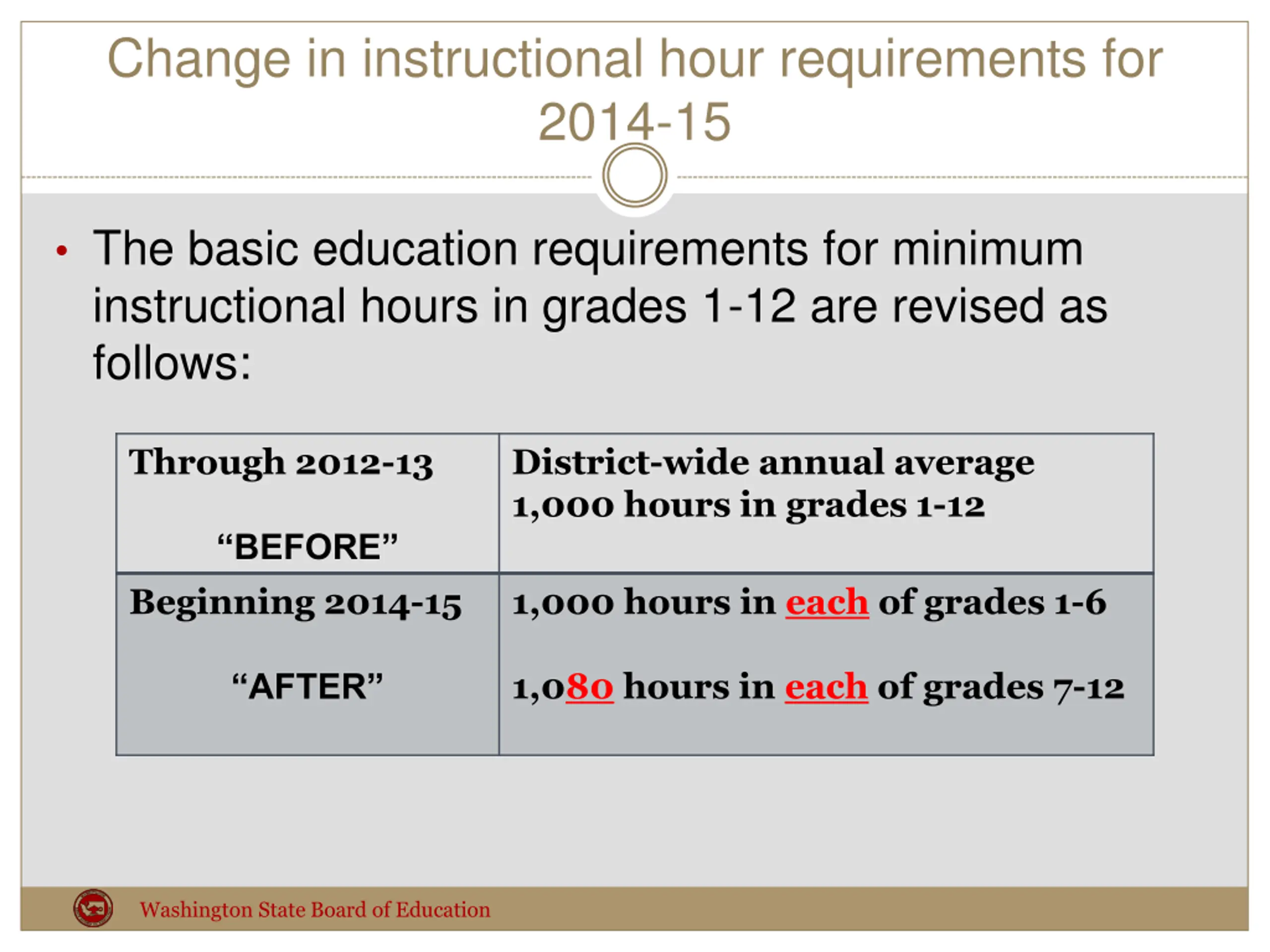 Change in instructional hour requirements for 2014-15 The basic education requirements for minimum instructional hours in grades 1-12 are revised as follows: Through 2012-13 District-wide annual average 1,000 hours in grades 1-12 BEFORE Beginning 2014-15 1,000 hours in each of grades 1-6 1,080 hours in each of grades 7-12 AFTER Washington State Board of Education