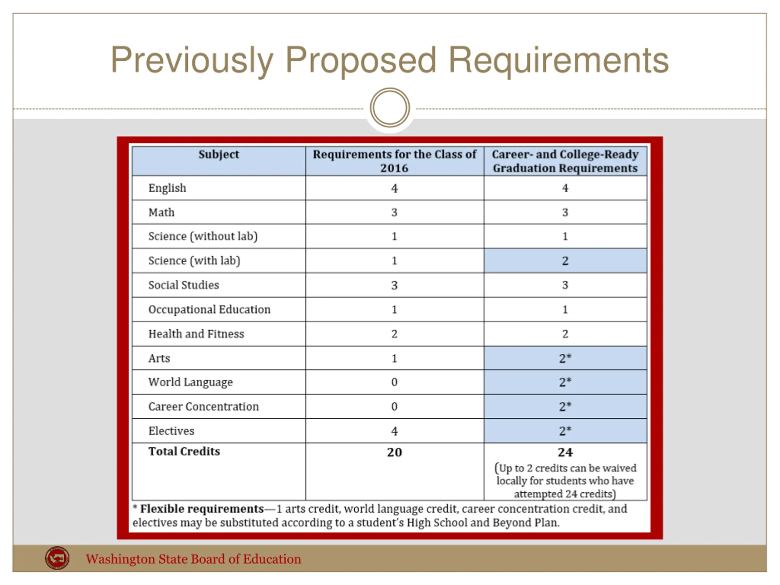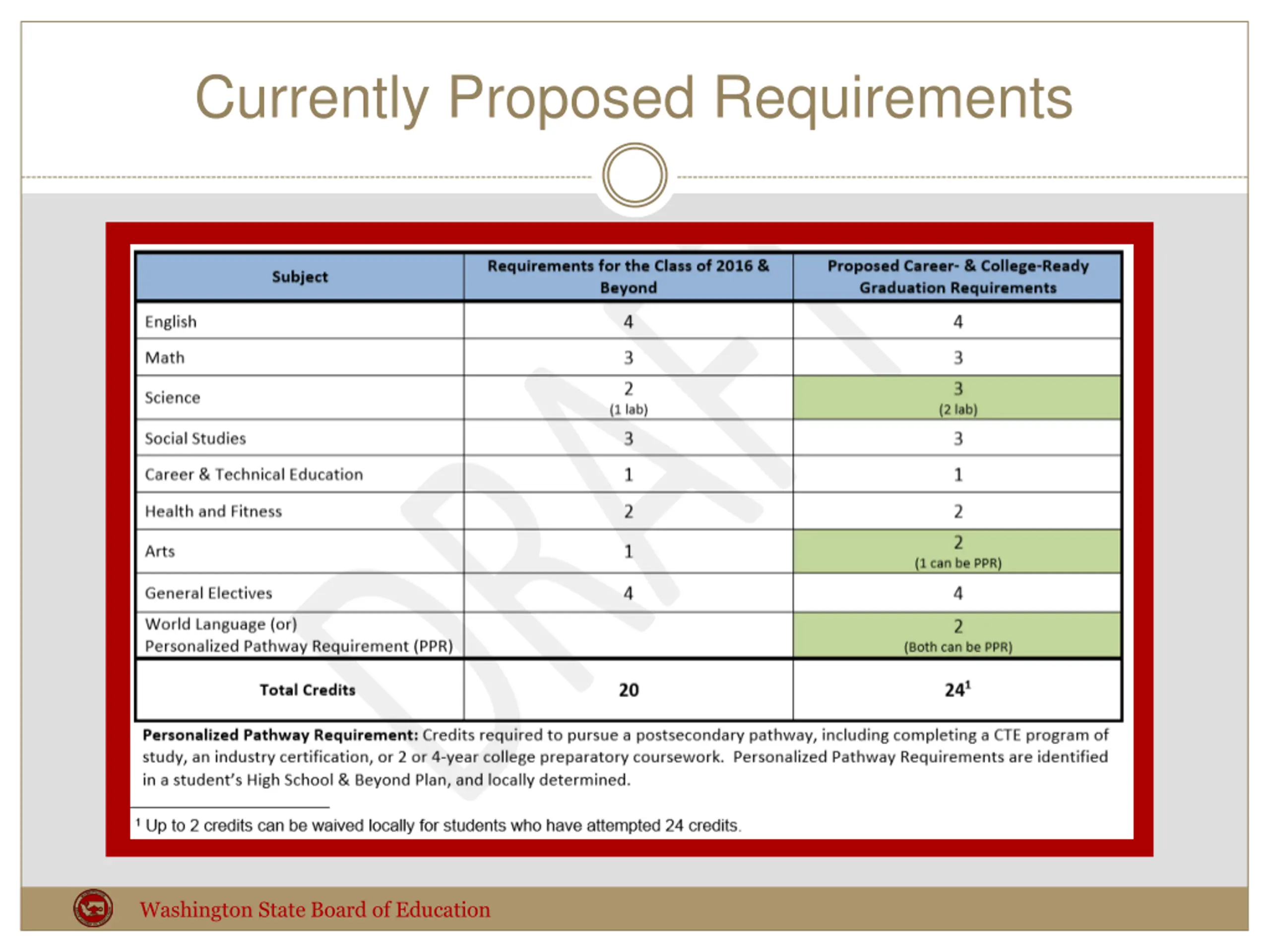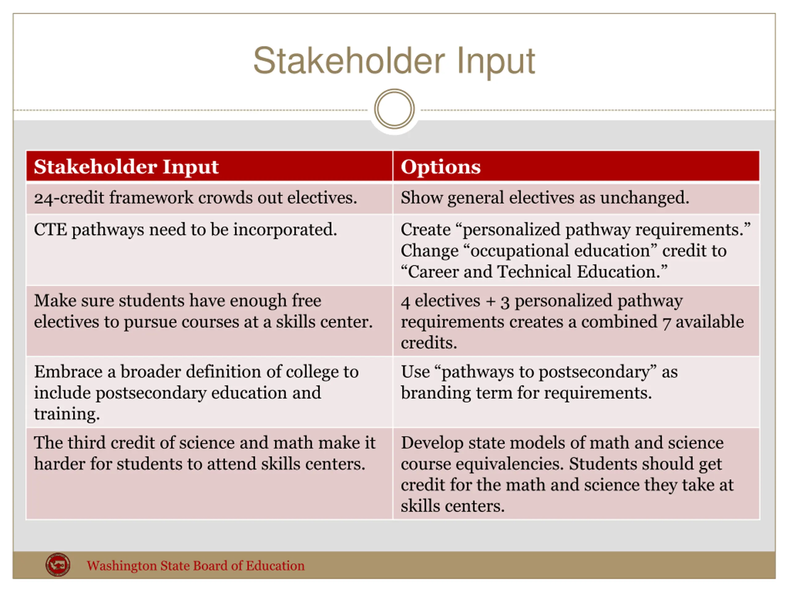 Stakeholder Input Stakeholder Input Options 24-credit framework crowds out electives. Show general electives as unchanged. CTE pathways need to be incorporated. Create personalized pathway requirements. Change occupational education credit to Career and Technical Education. Make sure students have enough free electives to pursue courses at a skills center. 4 electives + 3 personalized pathway requirements creates a combined 7 available credits. Embrace a broader definition of college to include postsecondary education and training. Use pathways to postsecondary as branding term for requirements. The third credit of science and math make it harder for students to attend skills centers. Develop state models of math and science course equivalencies. Students should get credit for the math and science they take at skills centers. Washington State Board of Education