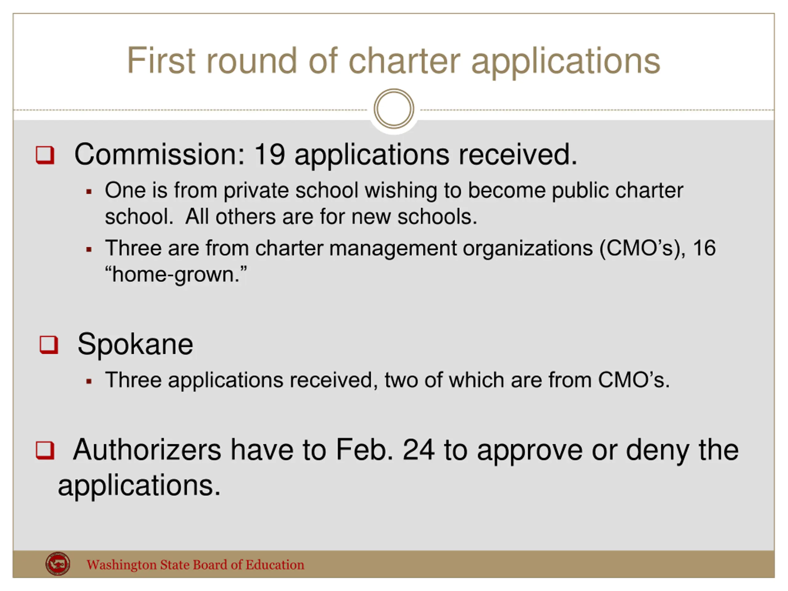 First round of charter applications Commission: 19 applications received. One is from private school wishing to become public charter school. All others are for new schools. Three are from charter management organizations (CMO s), 16 home-grown. Spokane Three applications received, two of which are from CMO s. Authorizers have to Feb. 24 to approve or deny the applications. Washington State Board of Education