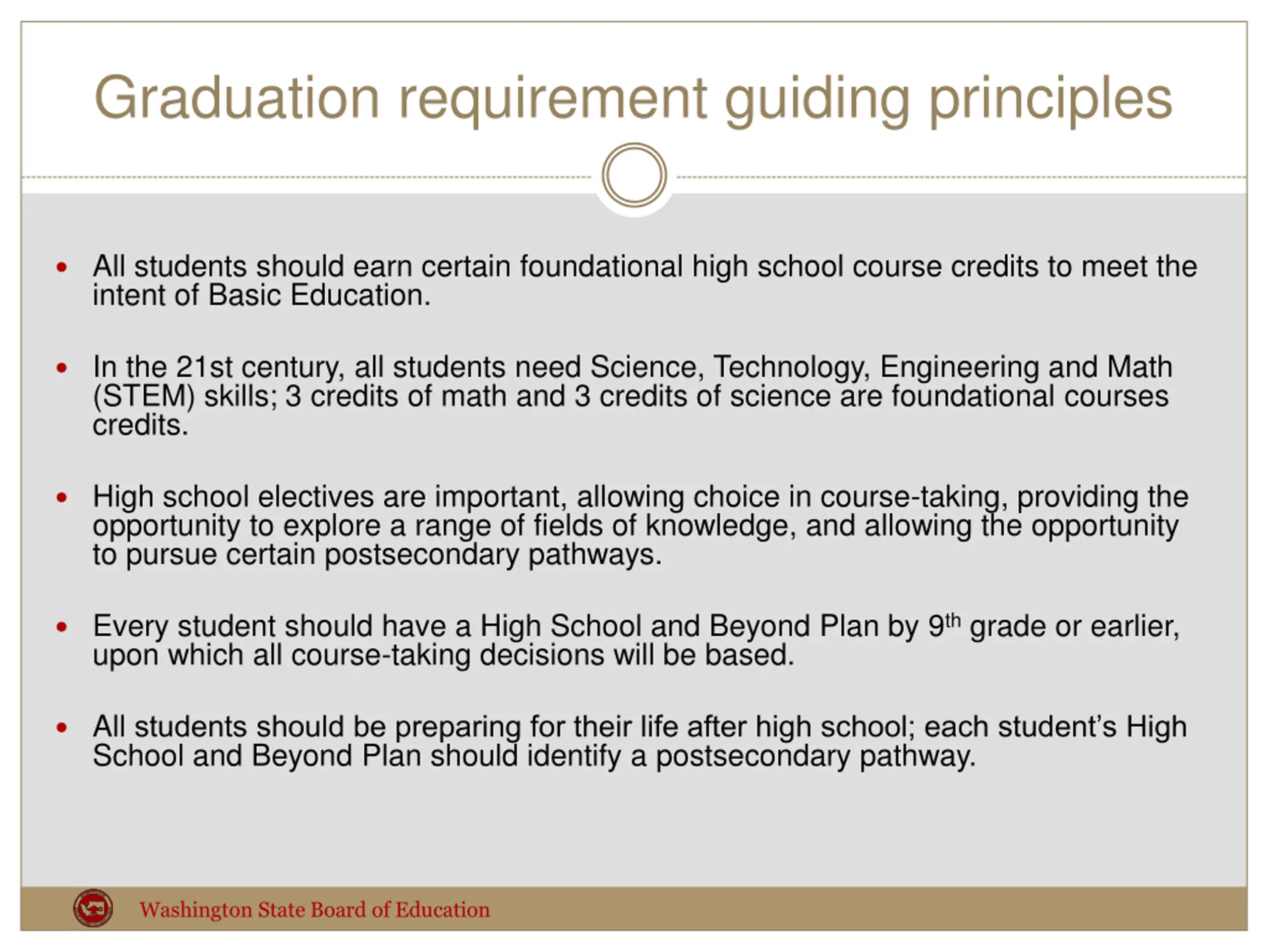 Graduation requirement guiding principles All students should earn certain foundational high school course credits to meet the intent of Basic Education. In the 21st century, all students need Science, Technology, Engineering and Math (STEM) skills; 3 credits of math and 3 credits of science are foundational courses credits. High school electives are important, allowing choice in course-taking, providing the opportunity to explore a range of fields of knowledge, and allowing the opportunity to pursue certain postsecondary pathways. Every student should have a High School and Beyond Plan by 9th grade or earlier, upon which all course-taking decisions will be based. All students should be preparing for their life after high school; each student s High School and Beyond Plan should identify a postsecondary pathway. Washington State Board of Education