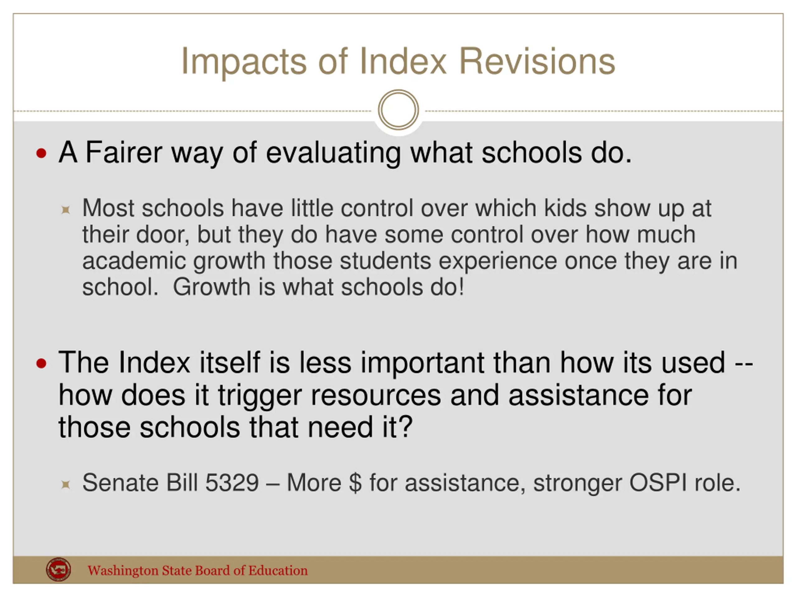 Impacts of Index Revisions A Fairer way of evaluating what schools do. Most schools have little control over which kids show up at their door, but they do have some control over how much academic growth those students experience once they are in school. Growth is what schools do! The Index itself is less important than how its used -- how does it trigger resources and assistance for those schools that need it? Senate Bill 5329 More $ for assistance, stronger OSPI role. Washington State Board of Education