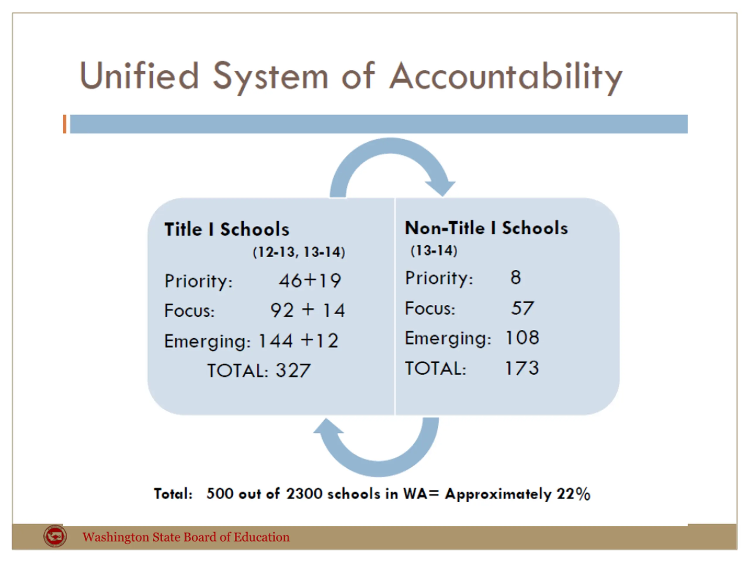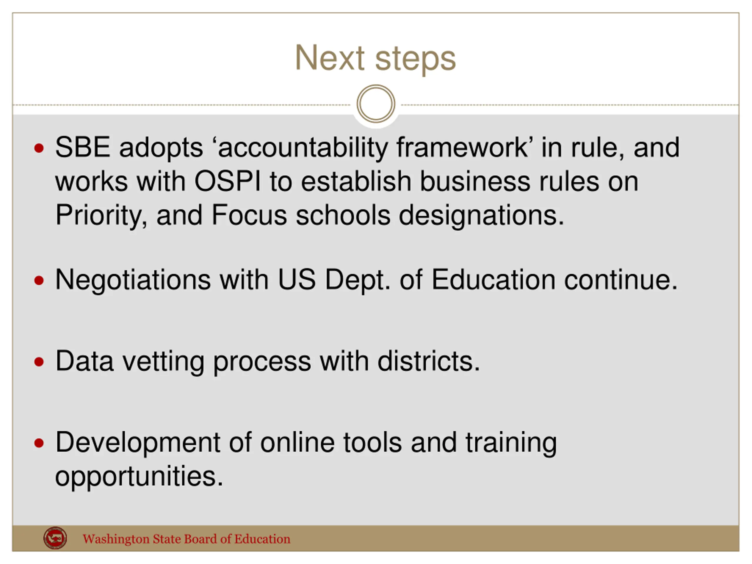 Next steps SBE adopts accountability framework in rule, and works with OSPI to establish business rules on Priority, and Focus schools designations. Negotiations with US Dept. of Education continue. Data vetting process with districts. Development of online tools and training opportunities. Washington State Board of Education
