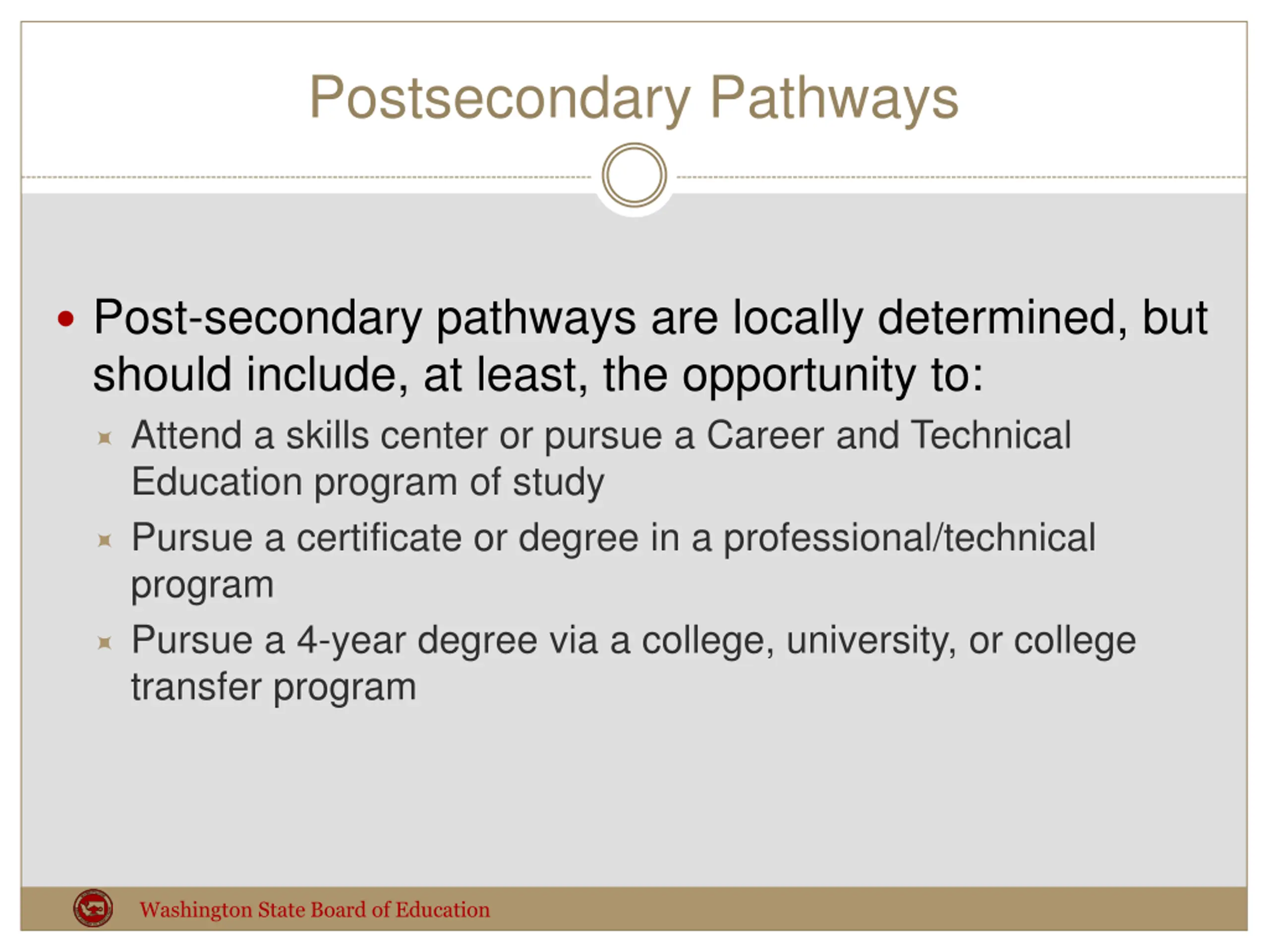 Postsecondary Pathways Post-secondary pathways are locally determined, but should include, at least, the opportunity to: Attend a skills center or pursue a Career and Technical Education program of study Pursue a certificate or degree in a professional/technical program Pursue a 4-year degree via a college, university, or college transfer program Washington State Board of Education