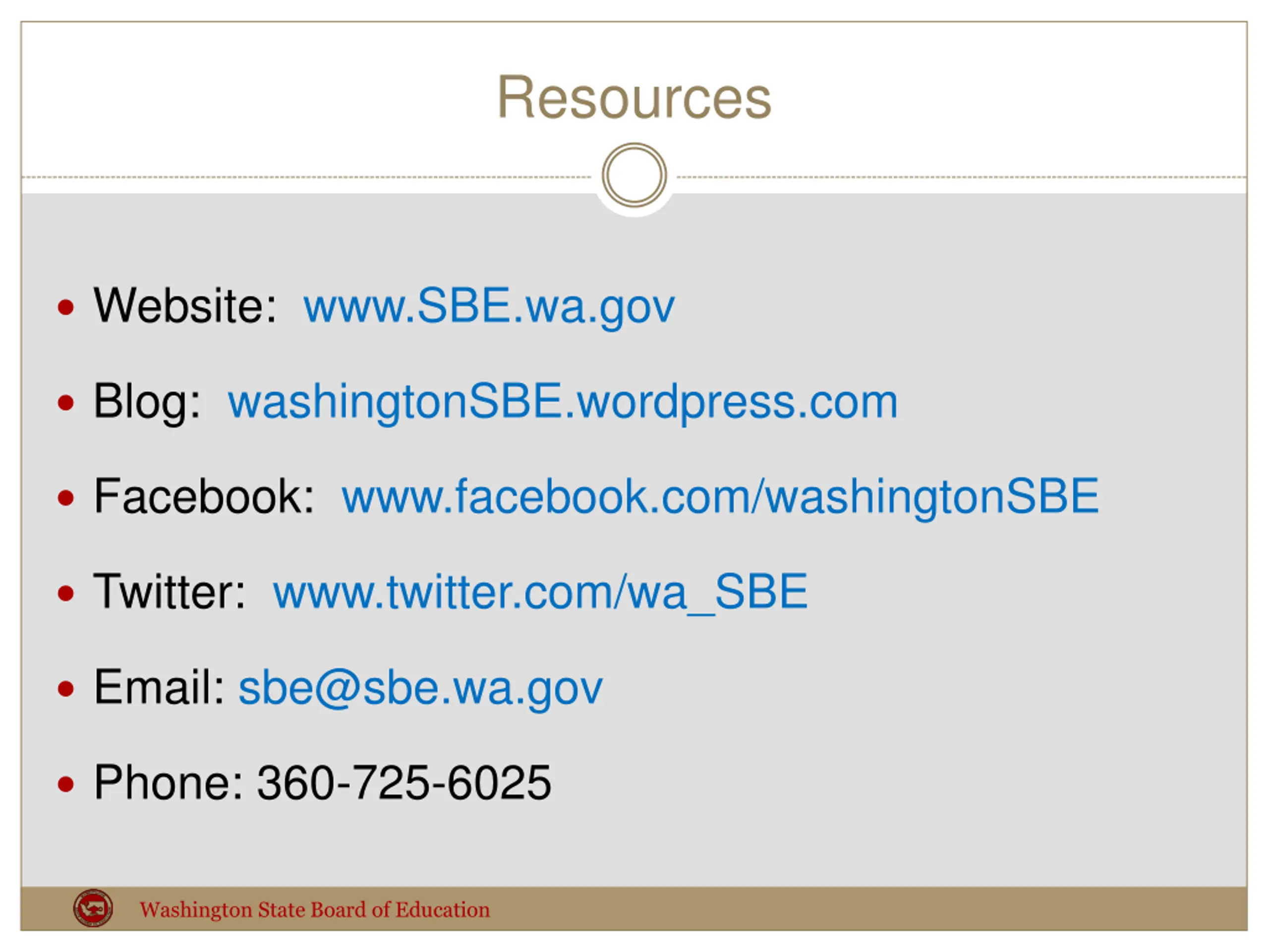 Resources Website: www.SBE.wa.gov Blog: washingtonSBE.wordpress.com Facebook: www.facebook.com/washingtonSBE Twitter: www.twitter.com/wa_SBE Email: sbe@sbe.wa.gov Phone: 360-725-6025 Washington State Board of Education