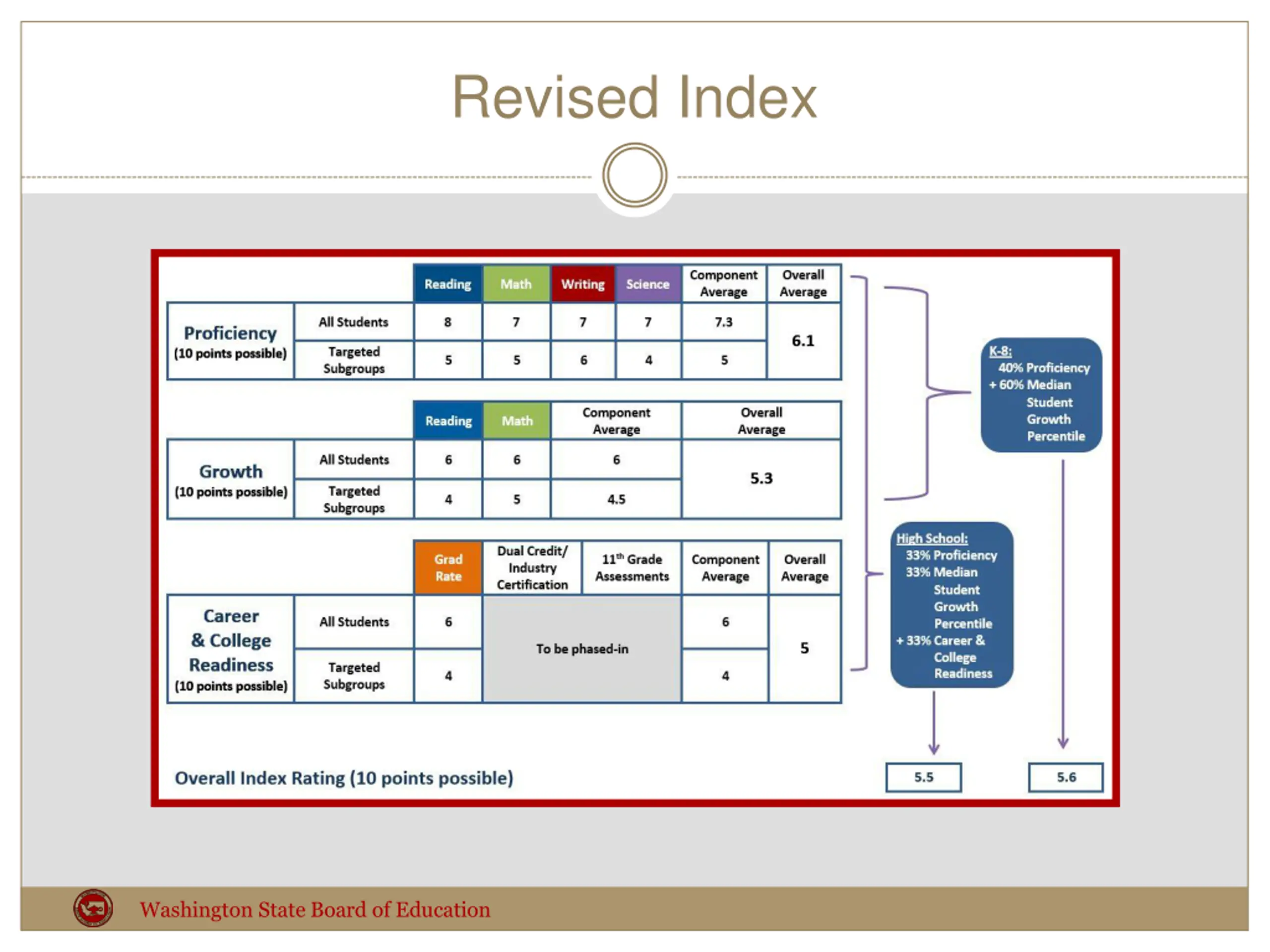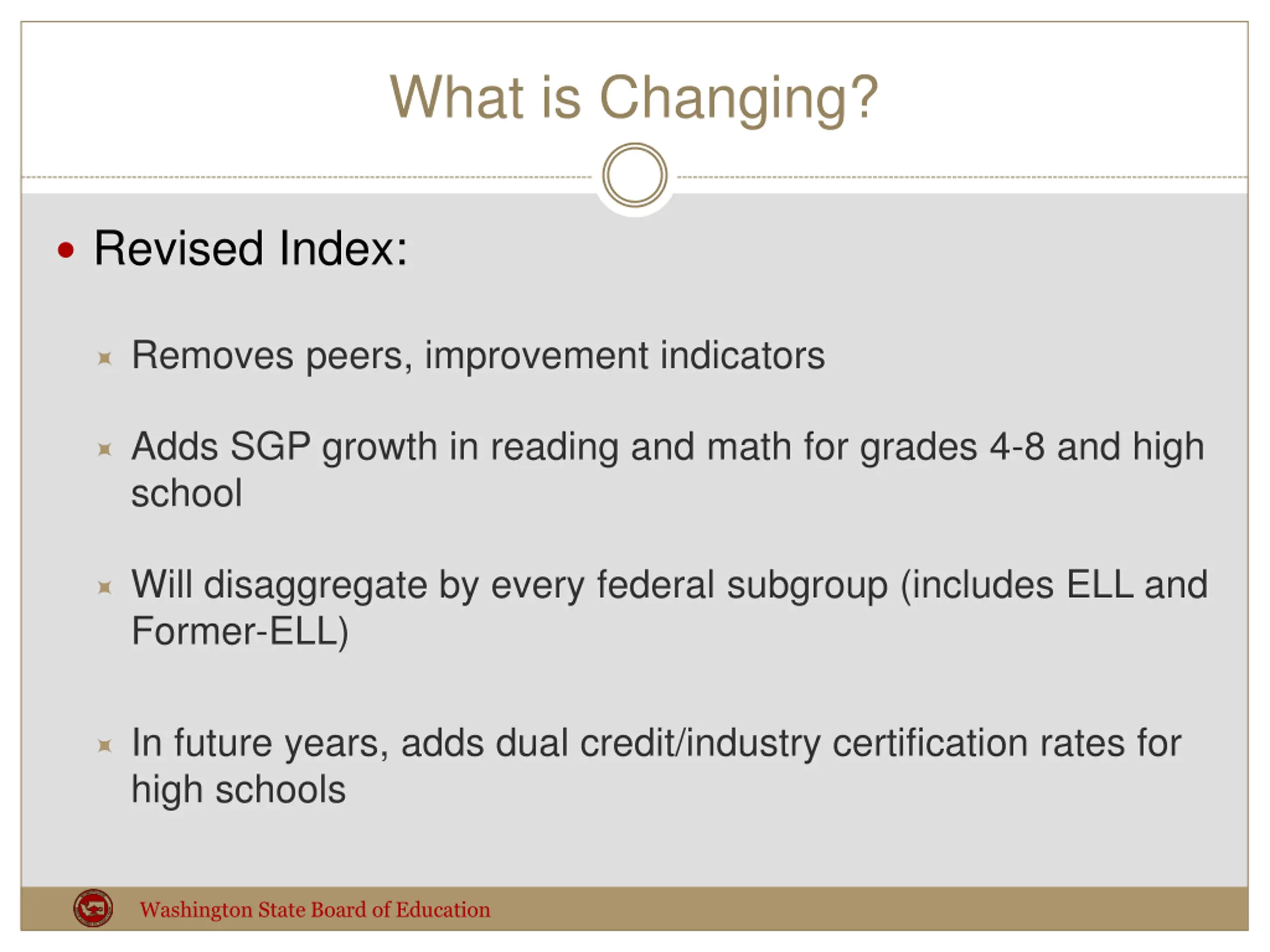 What is Changing? Revised Index: Removes peers, improvement indicators Adds SGP growth in reading and math for grades 4-8 and high school Will disaggregate by every federal subgroup (includes ELL and Former-ELL) In future years, adds dual credit/industry certification rates for high schools Washington State Board of Education