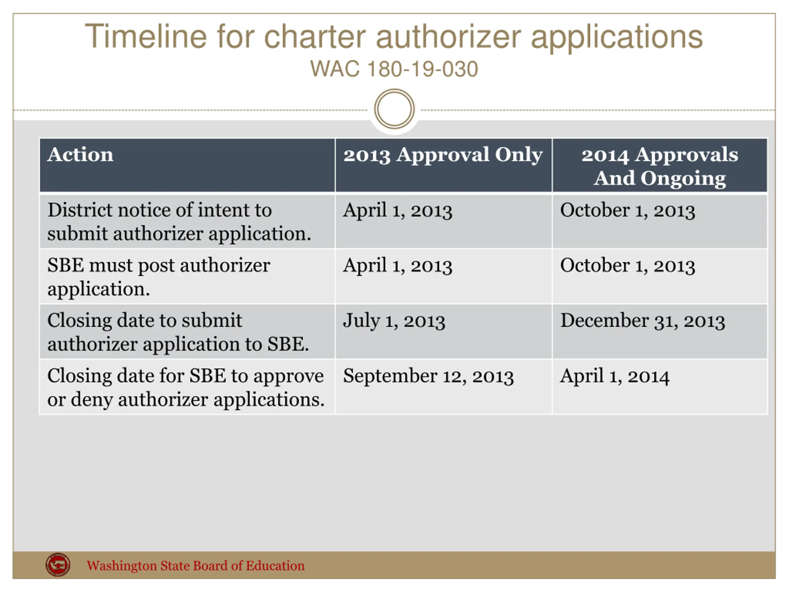 Timeline for charter authorizer applications WAC 180-19-030 Action 2013 Approval Only 2014 Approvals And Ongoing October 1, 2013 District notice of intent to submit authorizer application. SBE must post authorizer application. Closing date to submit authorizer application to SBE. Closing date for SBE to approve or deny authorizer applications. April 1, 2013 April 1, 2013 October 1, 2013 July 1, 2013 December 31, 2013 September 12, 2013 April 1, 2014 Washington State Board of Education