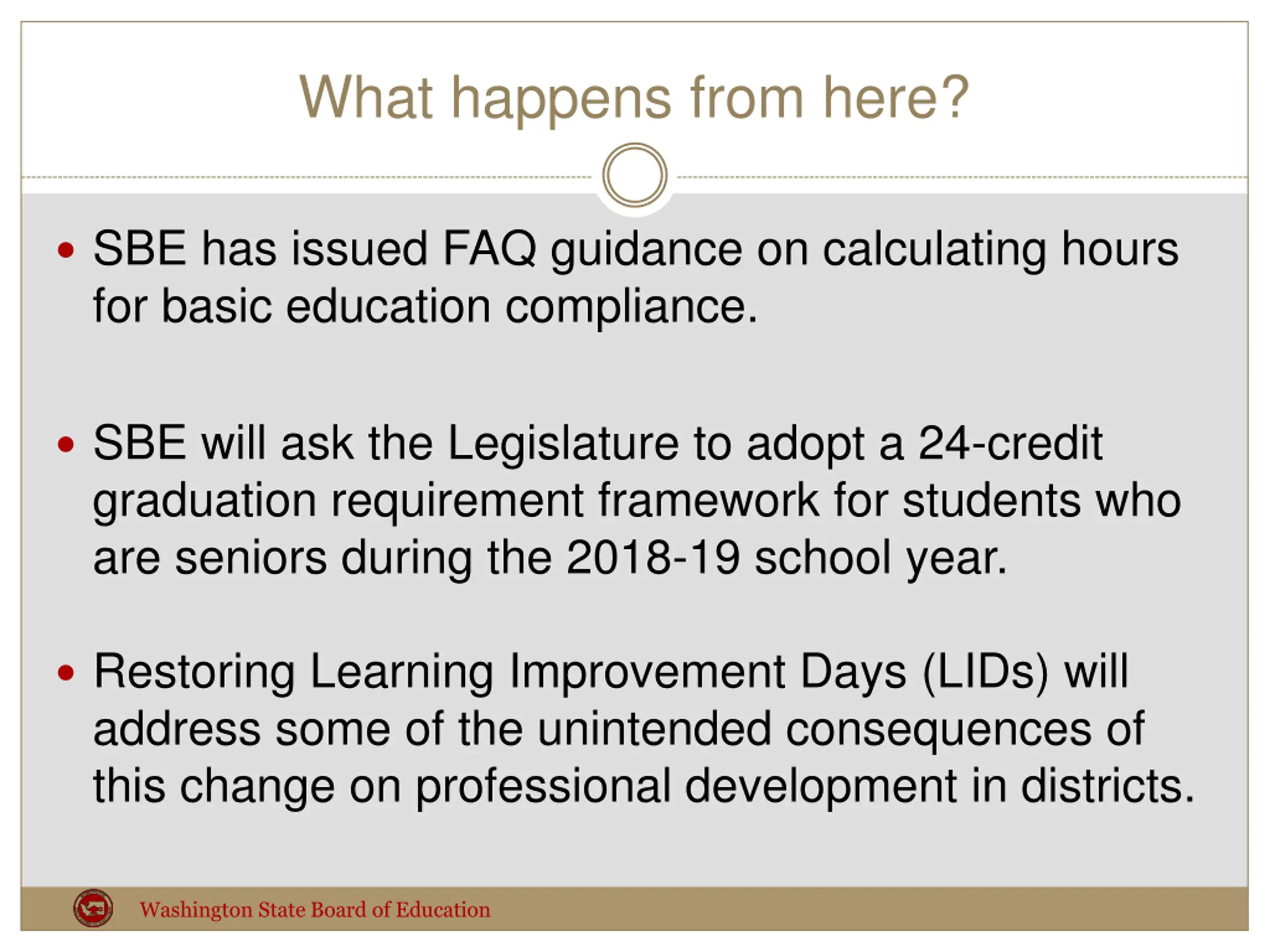 What happens from here? SBE has issued FAQ guidance on calculating hours for basic education compliance. SBE will ask the Legislature to adopt a 24-credit graduation requirement framework for students who are seniors during the 2018-19 school year. Restoring Learning Improvement Days (LIDs) will address some of the unintended consequences of this change on professional development in districts. Washington State Board of Education