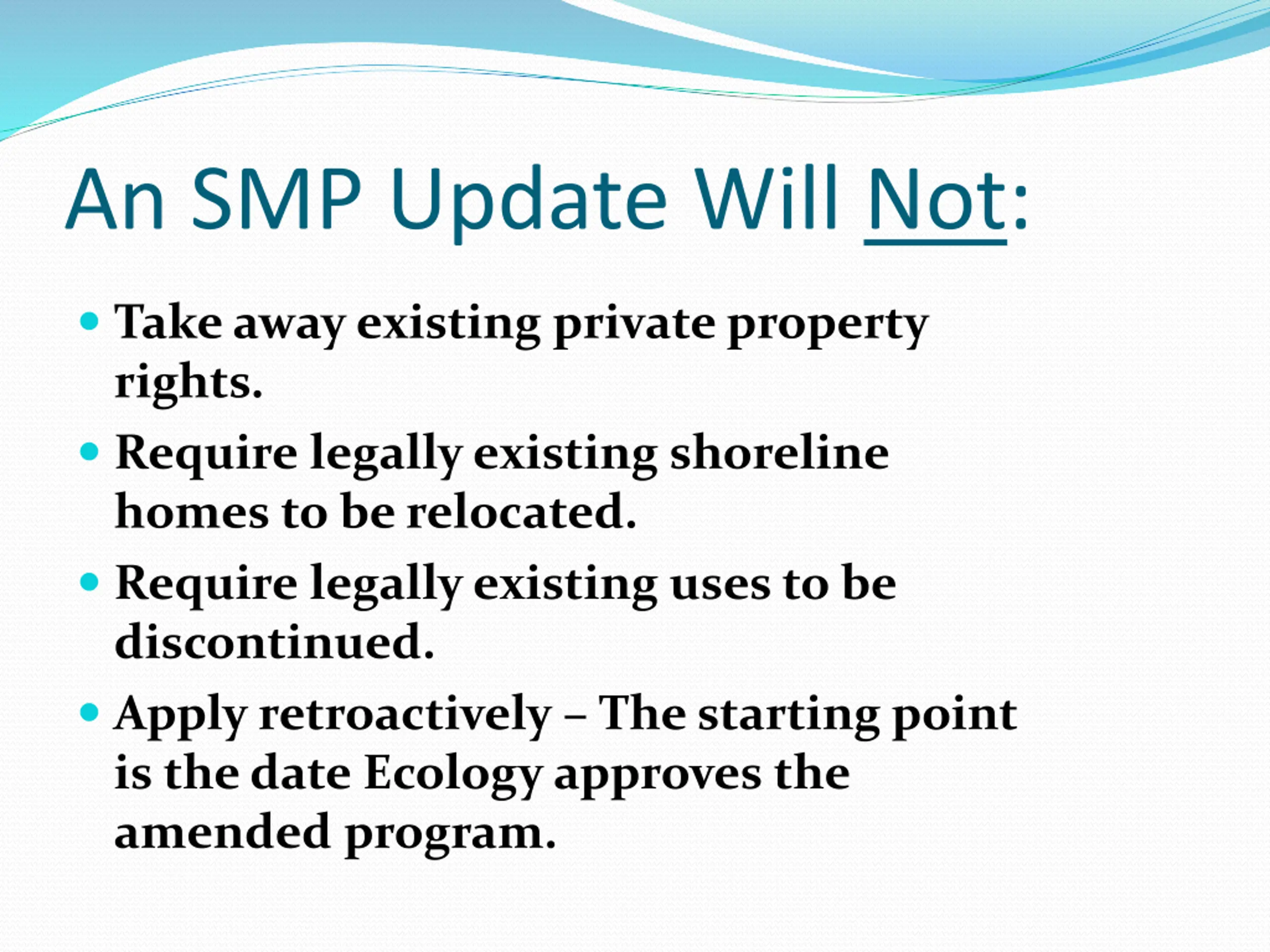 An SMP Update Will Not: Take away existing private property rights. Require legally existing shoreline homes to be relocated. Require legally existing uses to be discontinued. Apply retroactively The starting point is the date Ecology approves the amended program.
