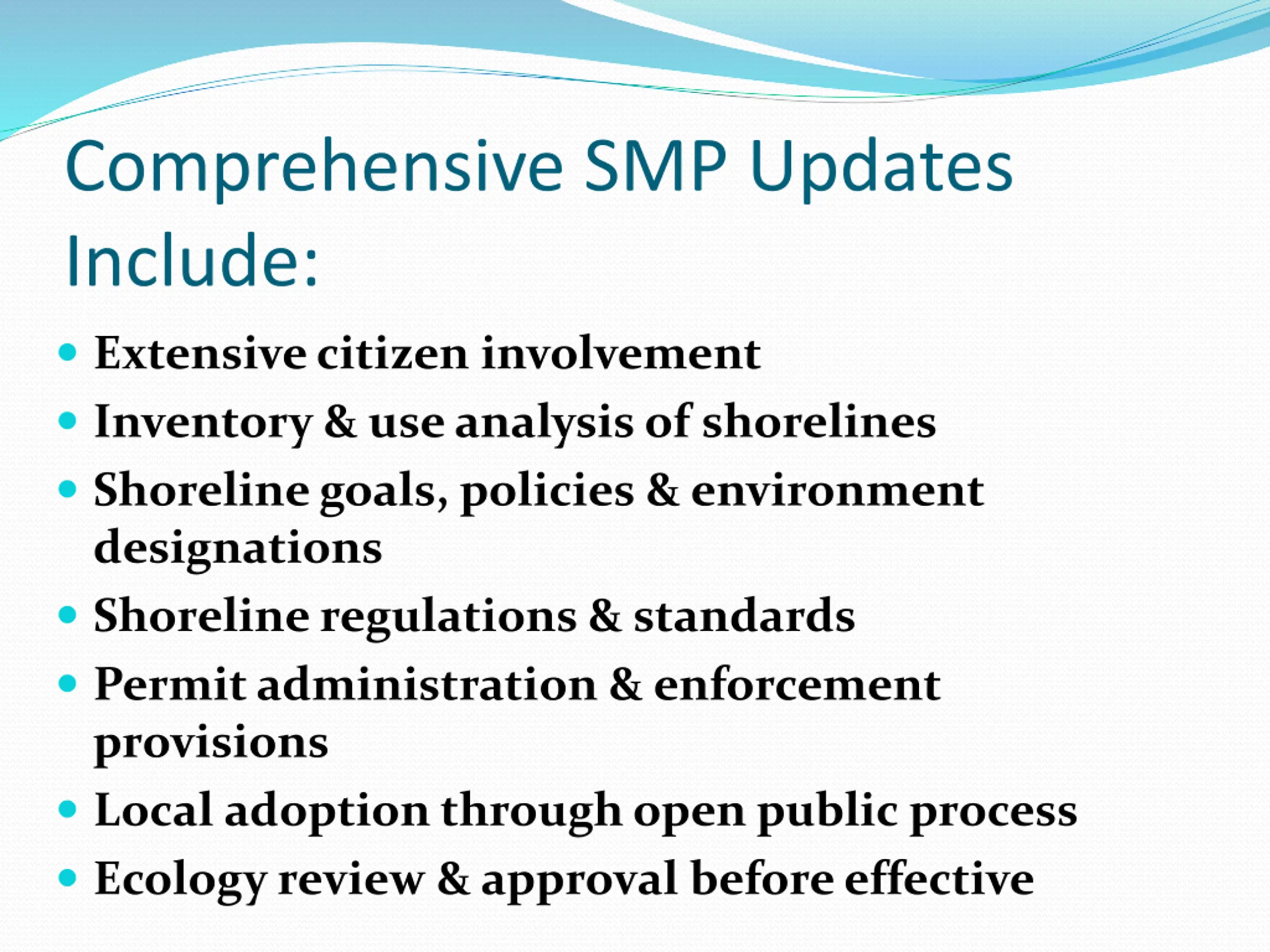 Comprehensive SMP Updates Include: Extensive citizen involvement Inventory & use analysis of shorelines Shoreline goals, policies & environment designations Shoreline regulations & standards Permit administration & enforcement provisions Local adoption through open public process Ecology review & approval before effective