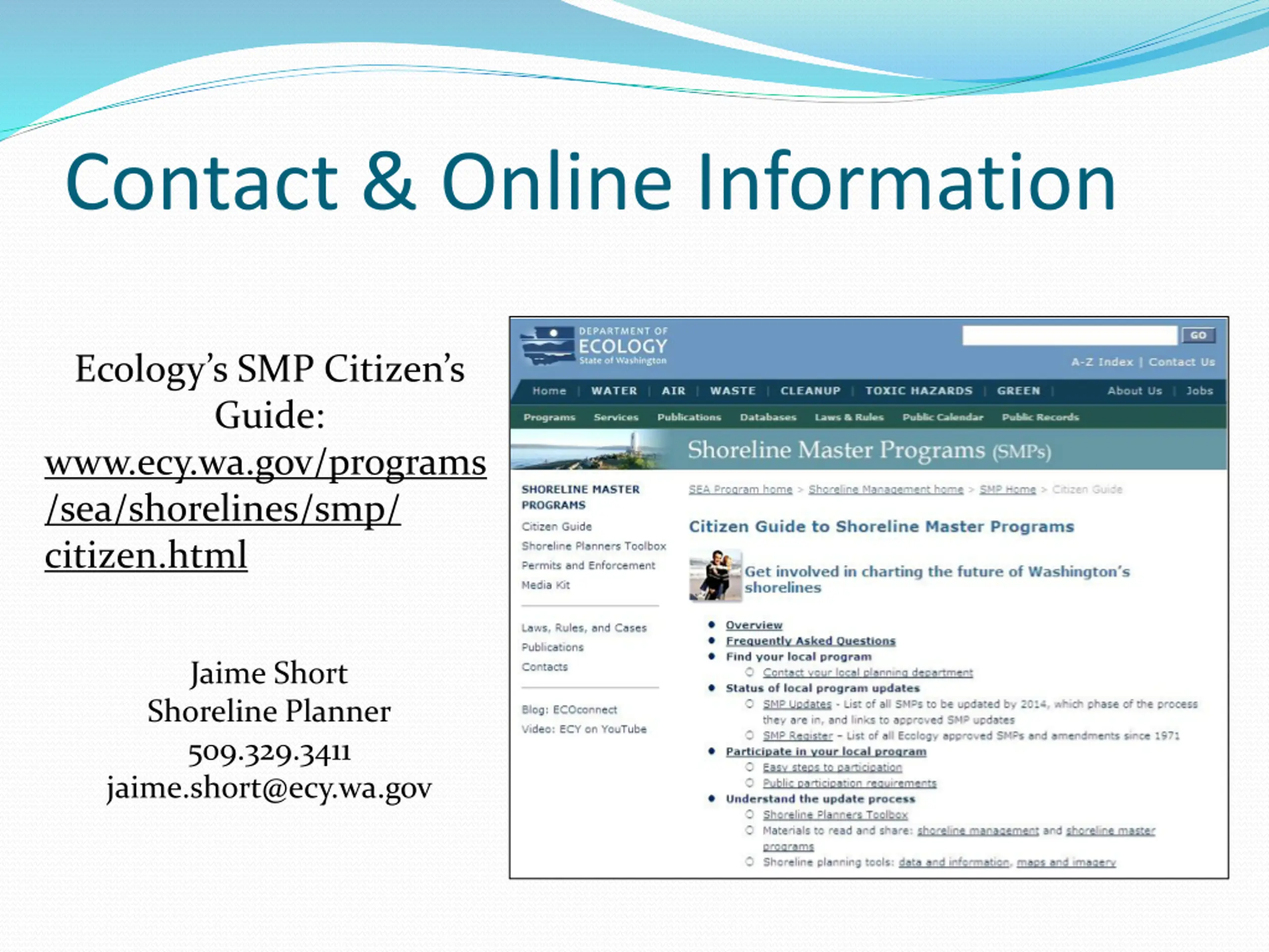 Contact & Online Information Ecology s SMP Citizen s Guide: www.ecy.wa.gov/programs /sea/shorelines/smp/ citizen.html Jaime Short Shoreline Planner 509.329.3411 jaime.short@ecy.wa.gov