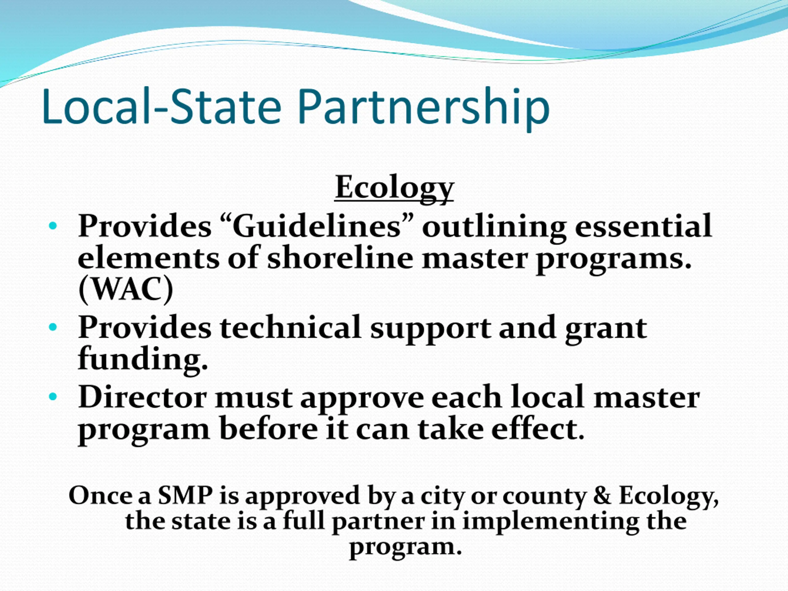 LocalState Partnership Ecology Provides Guidelines outlining essential elements of shoreline master programs. (WAC) Provides technical support and grant funding. Director must approve each local master program before it can take effect. Once a SMP is approved by a city or county & Ecology, the state is a full partner in implementing the program.