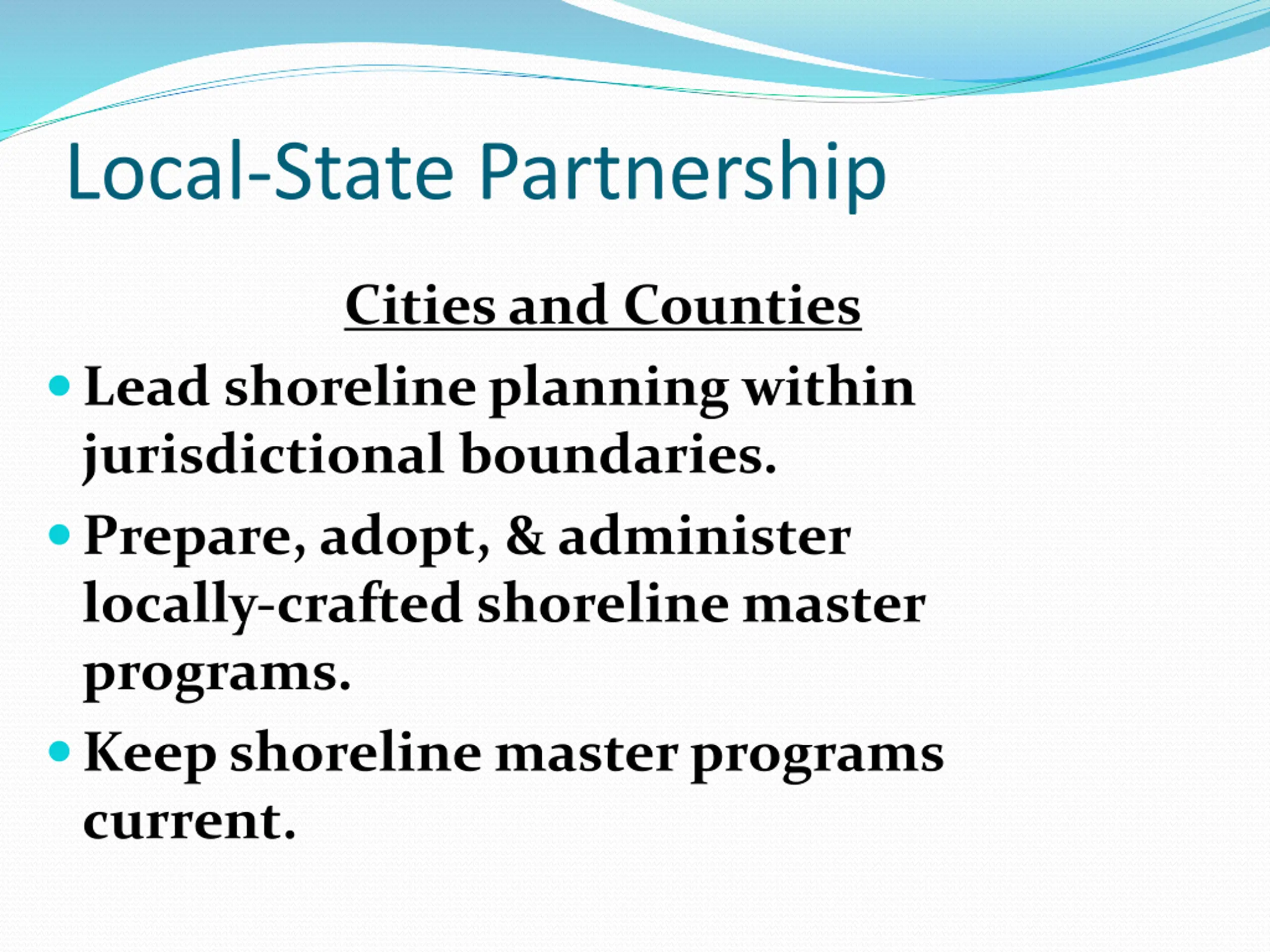 LocalState Partnership Cities and Counties Lead shoreline planning within jurisdictional boundaries. Prepare, adopt, & administer locally crafted shoreline master programs. Keep shoreline master programs current.