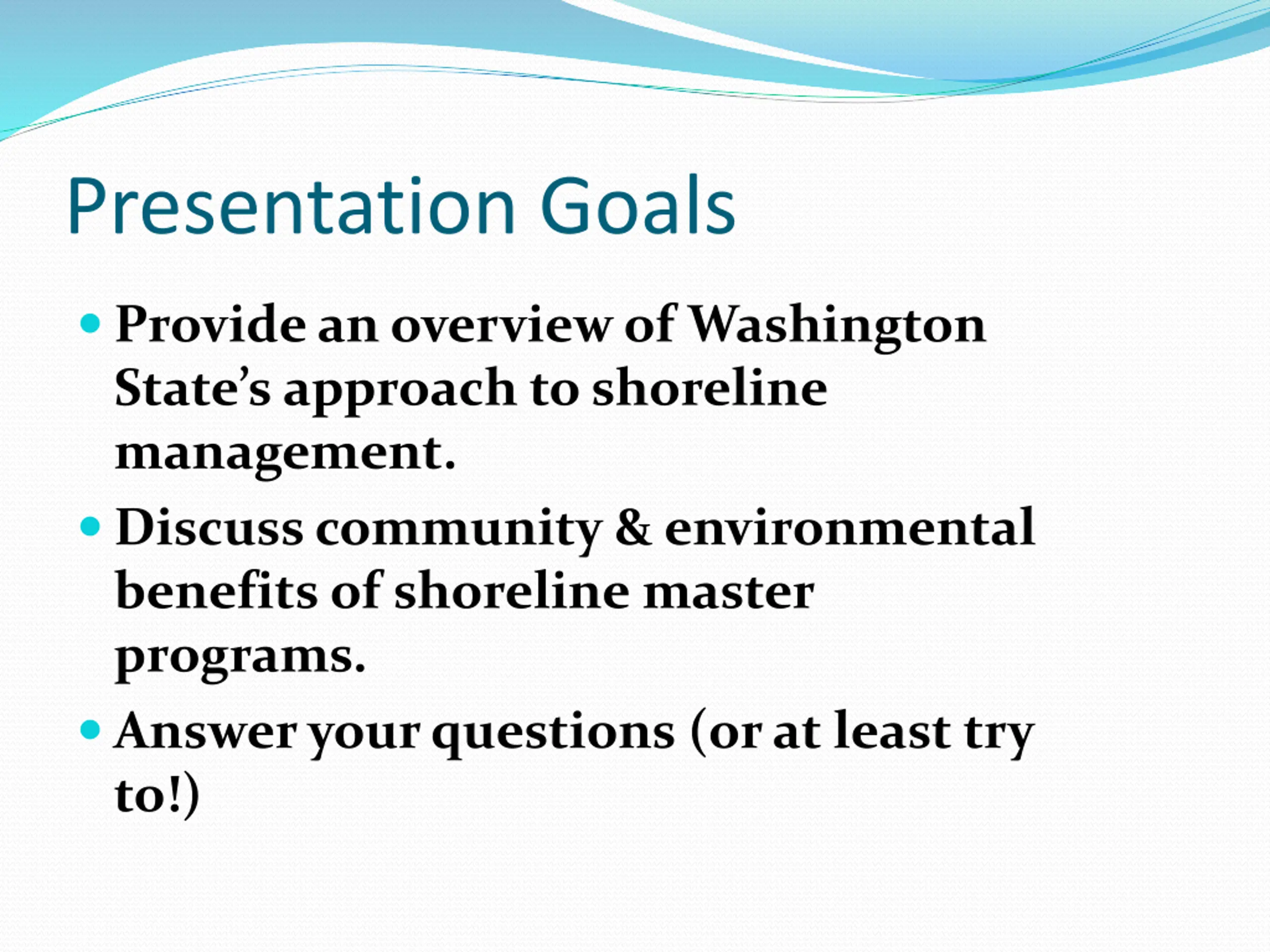 Presentation Goals Provide an overview of Washington State s approach to shoreline management. Discuss community & environmental benefits of shoreline master programs. Answer your questions (or at least try to!)