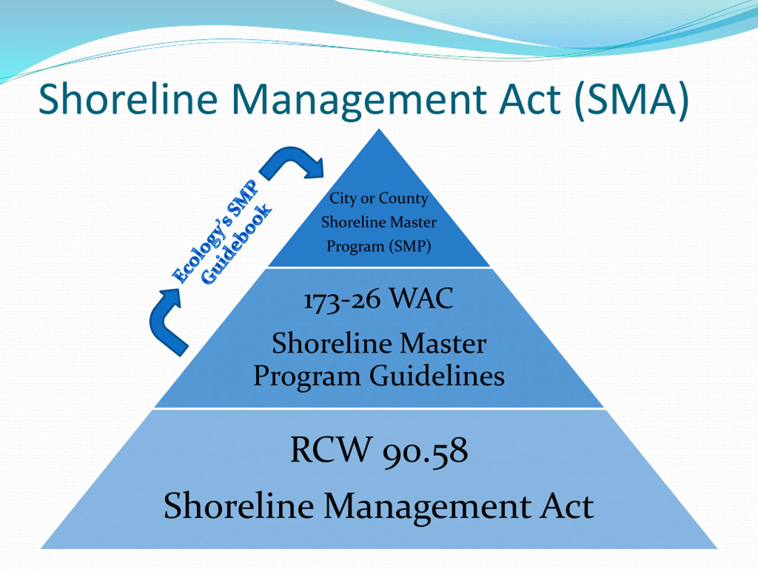 Shoreline Management Act (SMA) Ecology s SMP City or County Guidebook Shoreline Master Program (SMP) 173-26 WAC Shoreline Master Program Guidelines RCW 90.58 Shoreline Management Act