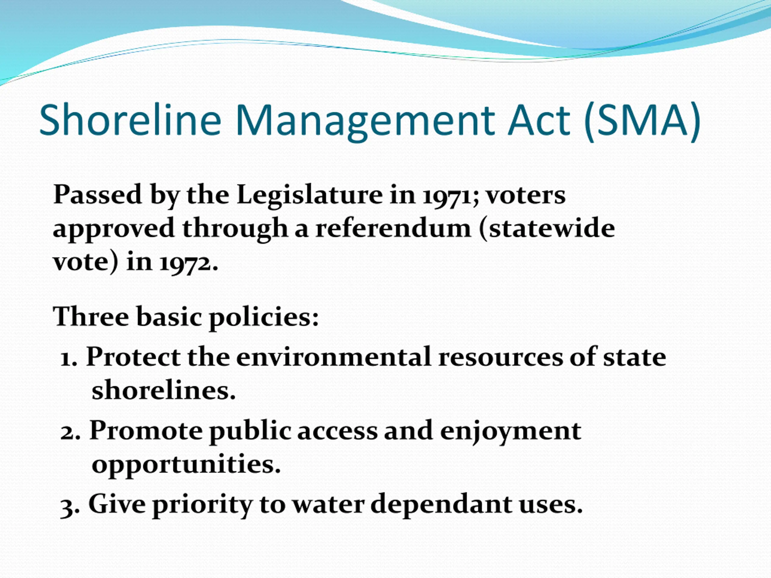 Shoreline Management Act (SMA) Passed by the Legislature in 1971; voters approved through a referendum (statewide vote) in 1972. Three basic policies: 1. Protect the environmental resources of state shorelines. 2. Promote public access and enjoyment opportunities. 3. Give priority to water dependant uses.