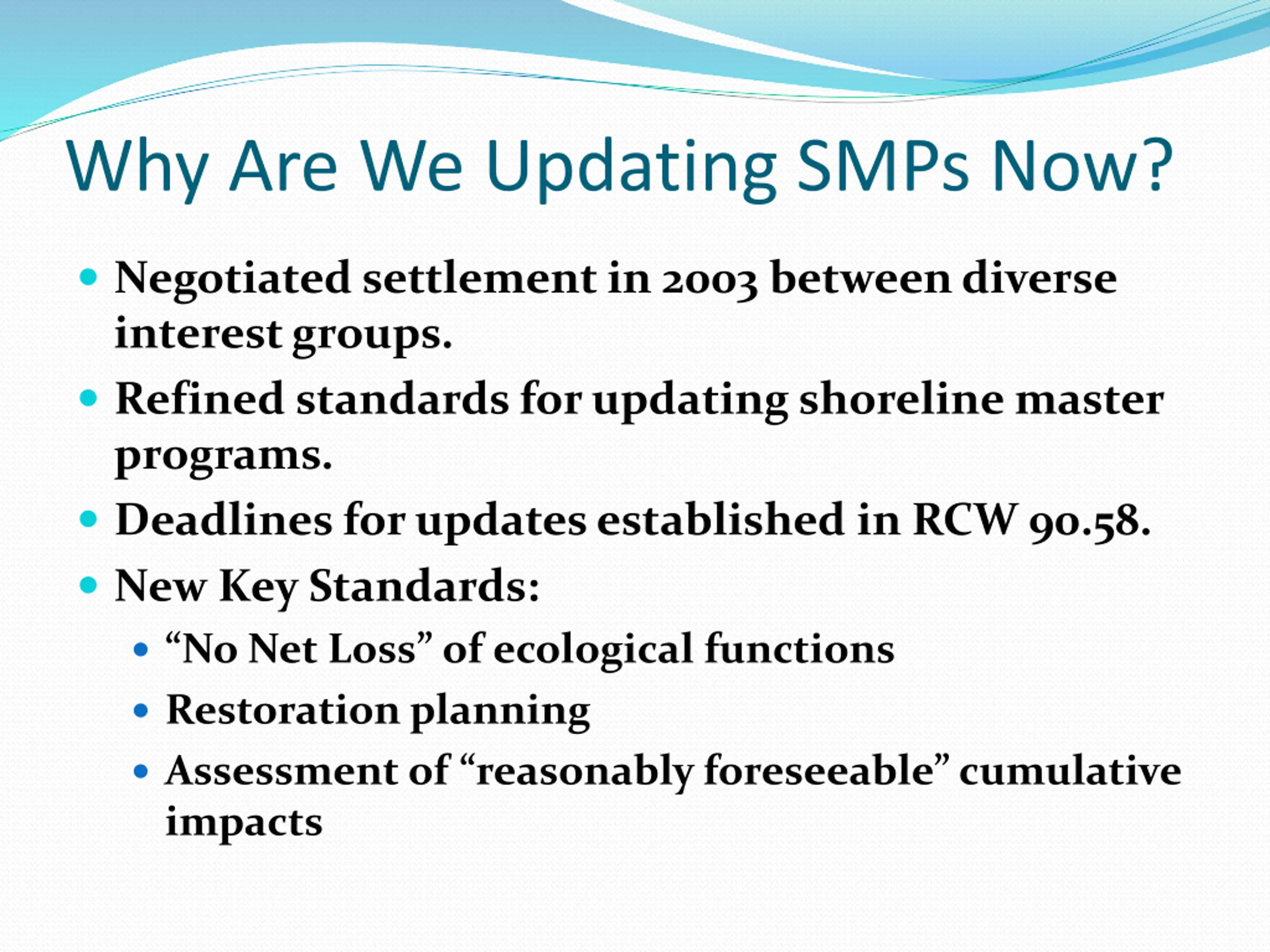 Why Are We Updating SMPs Now? Negotiated settlement in 2003 between diverse interest groups. Refined standards for updating shoreline master programs. Deadlines for updates established in RCW 90.58. New Key Standards: No Net Loss of ecological functions Restoration planning Assessment of reasonably foreseeable cumulative impacts