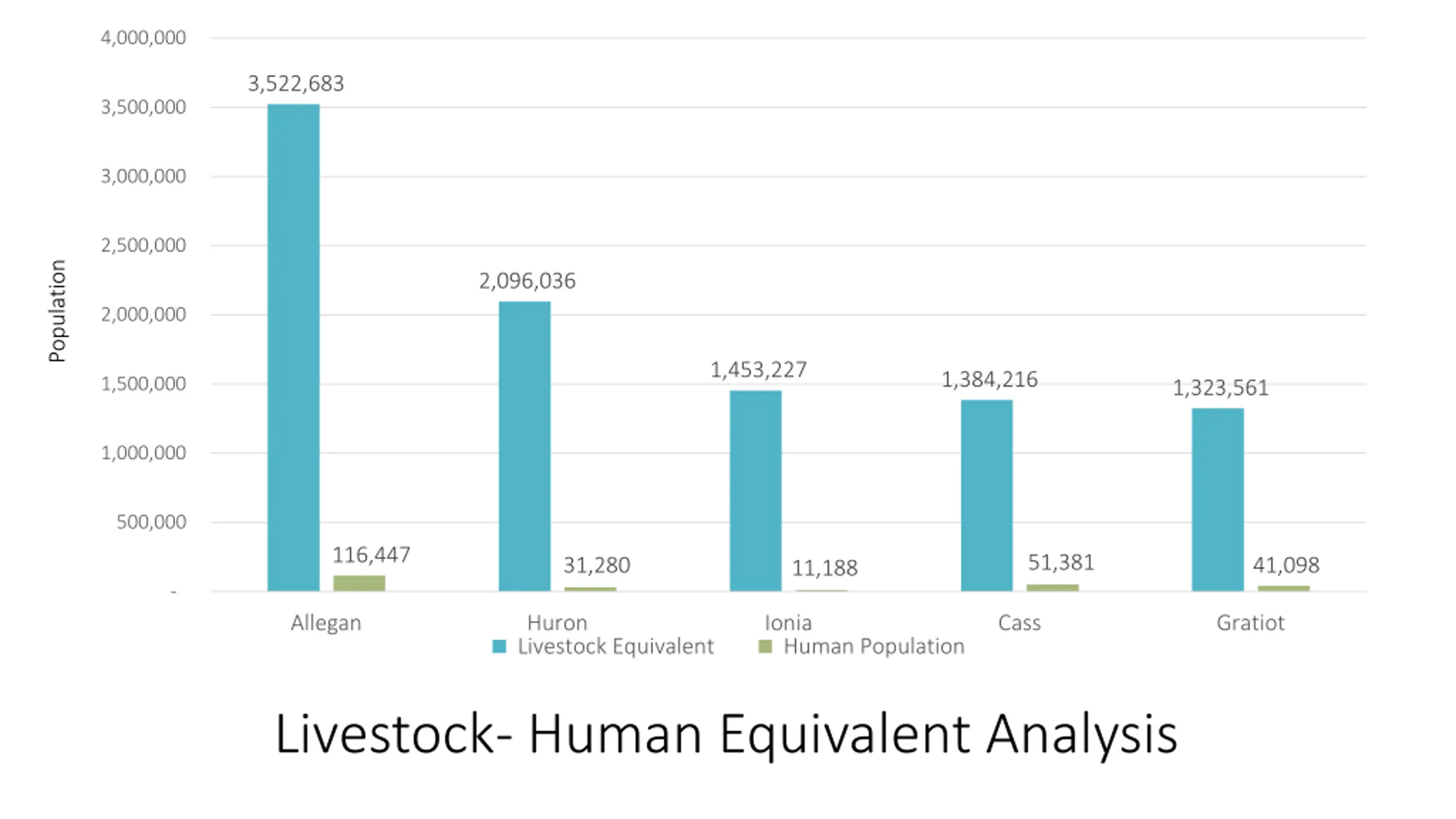 4,000,000 3,522,683 3,500,000 3,000,000 2,500,000 Population 2,096,036 2,000,000 1,453,227 1,384,216 1,500,000 1,323,561 1,000,000 500,000 116,447 51,381 31,280 41,098 11,188 - Allegan Huron Livestock Equivalent Ionia Human Population Cass Gratiot Livestock- Human Equivalent Analysis
