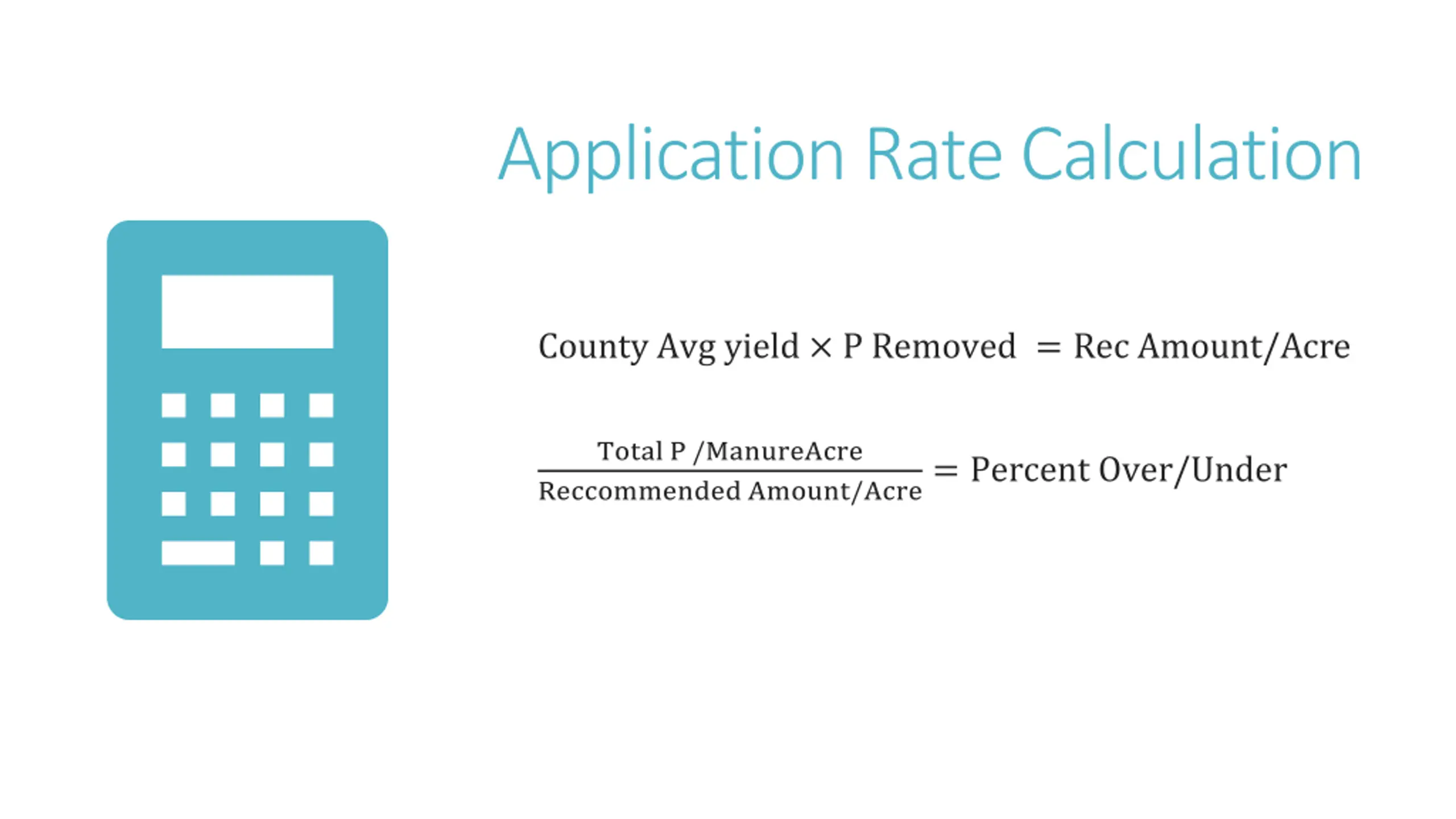 Application Rate Calculation County Avg yield P Removed = Rec Amount/Acre Total P /ManureAcre Reccommended Amount/Acre= Percent Over/Under