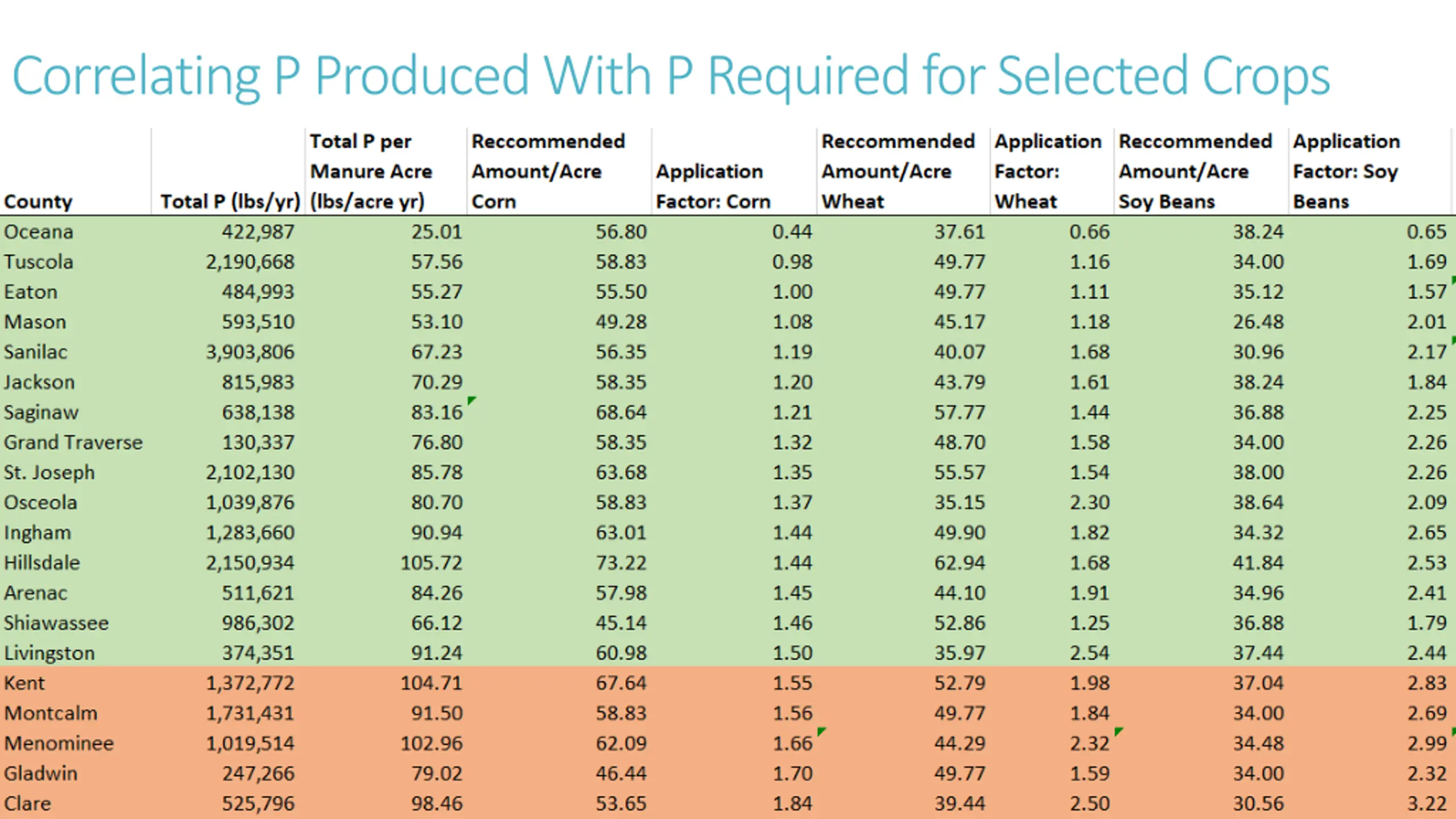 Application Rates Found kg/acre year and lbs/acre year through MRA data (USDA) Considering Phosphorus: Land available (Manure Acres USDA Census of Agriculture) Phosphorus removed from soil upon harvest (MSU Report) County average yield (USDA 2017) Corn Soybeans Wheat Sugar Beets