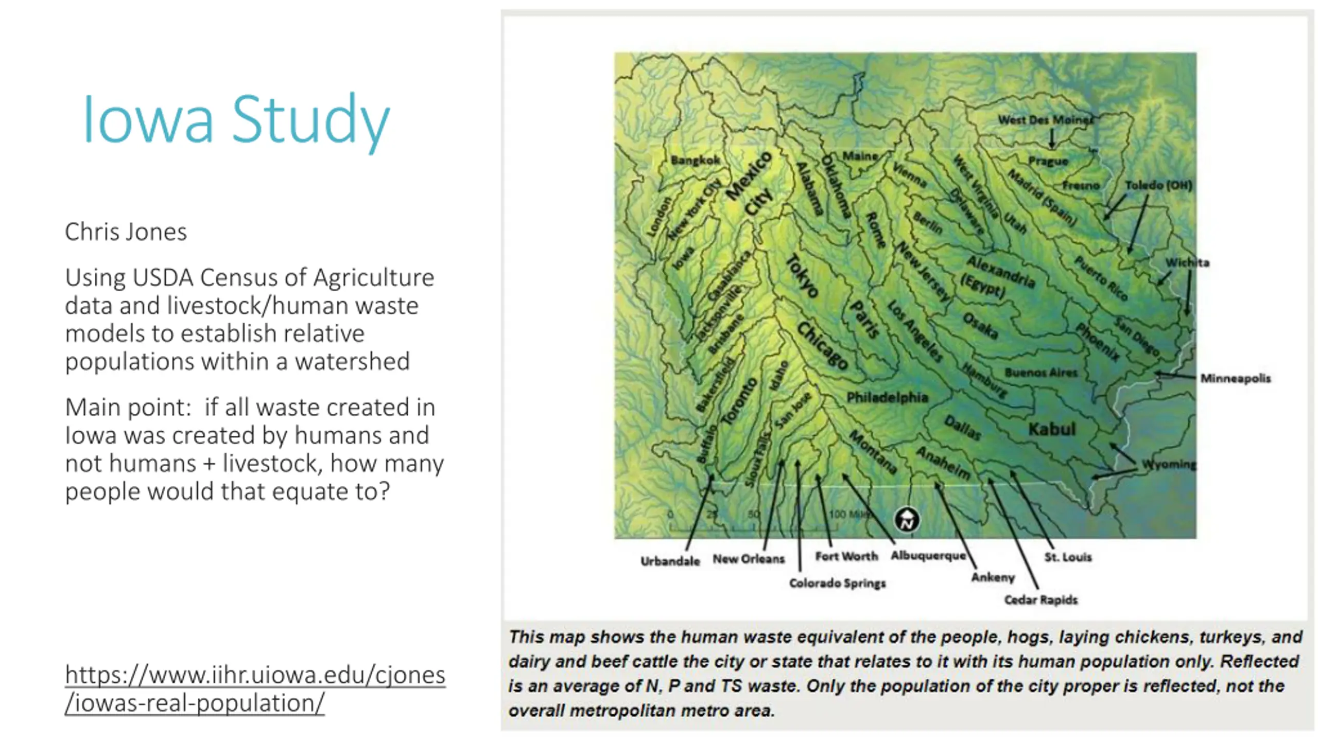 Iowa Study Chris Jones Using USDA Census of Agriculture data and livestock/human waste models to establish relative populations within a watershed Main point: if all waste created in Iowa was created by humans and not humans + livestock, how many people would that equate to? https://www.iihr.uiowa.edu/cjones /iowas-real-population/