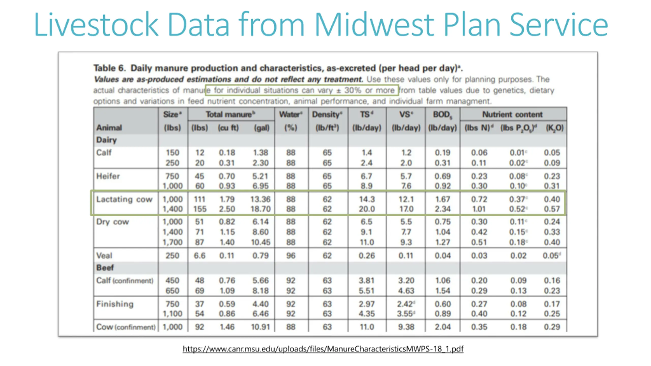 Livestock Data from Midwest Plan Service https://www.canr.msu.edu/uploads/files/ManureCharacteristicsMWPS-18_1.pdf
