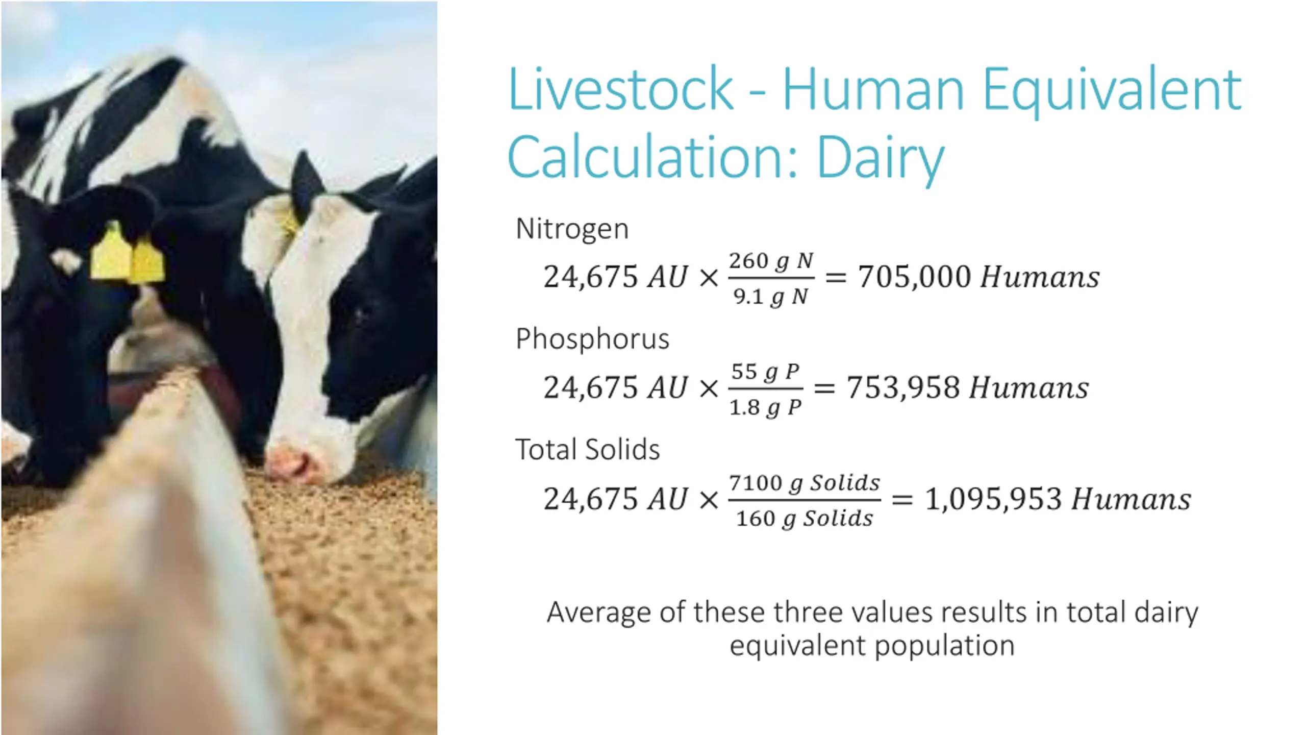 Livestock - Human Equivalent Calculation: Dairy Nitrogen 24,675 ?? 260 ? ? 9.1 ? ?= 705,000 ?????? Phosphorus 24,675 ?? 55 ? ? 1.8 ? ?= 753,958 ?????? Total Solids 24,675 ?? 7100 ? ?????? 160 ? ??????= 1,095,953 ?????? Average of these three values results in total dairy equivalent population