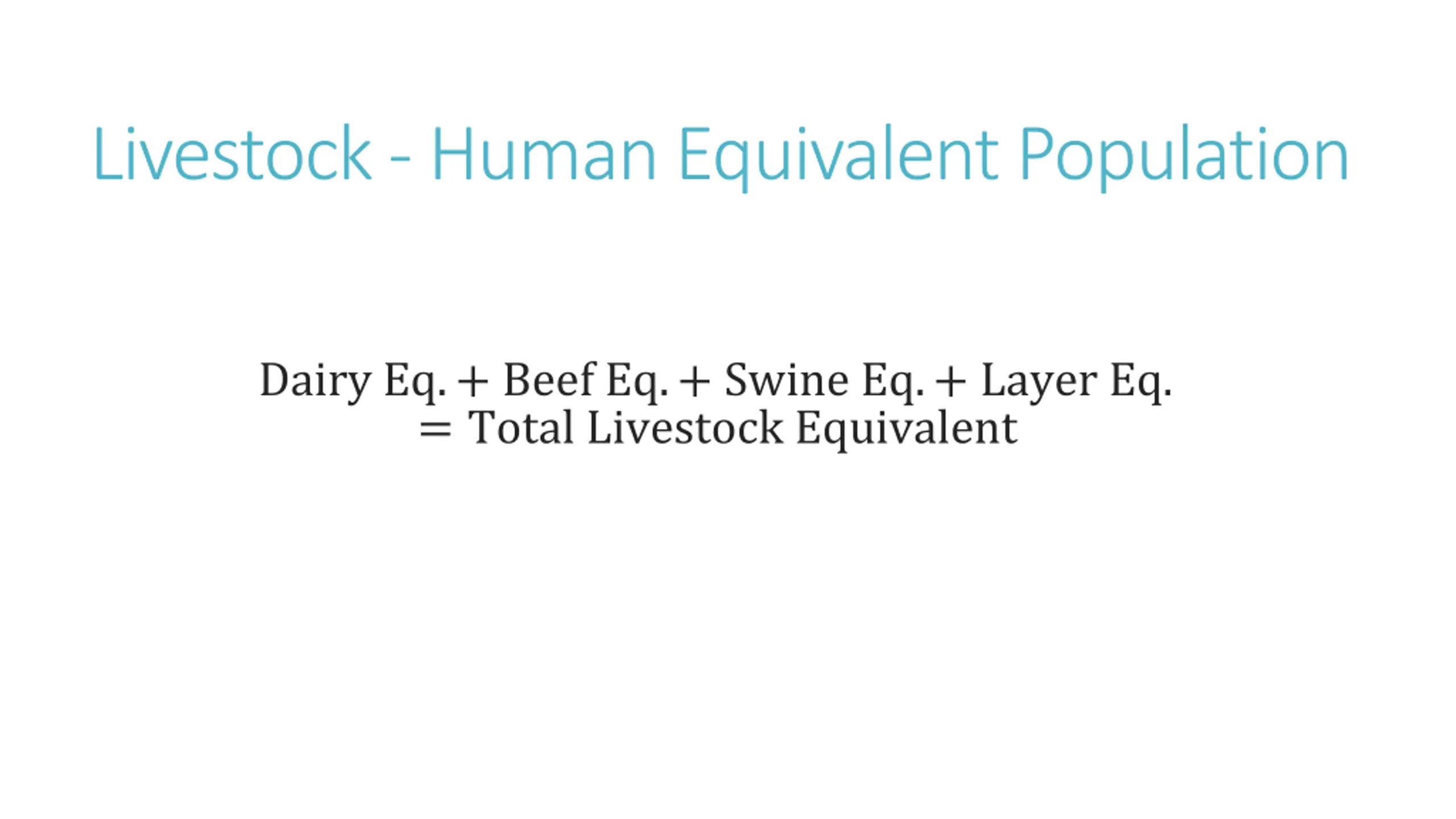Livestock - Human Equivalent Population Dairy Eq.+ Beef Eq.+ Swine Eq.+ Layer Eq. = Total Livestock Equivalent