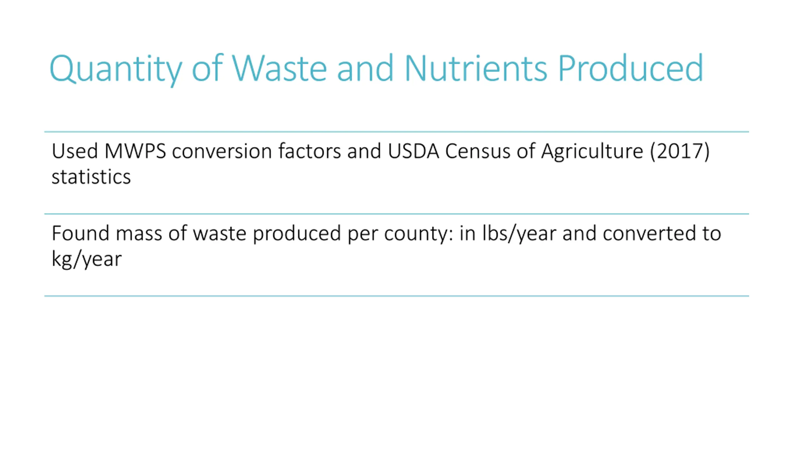 Quantity of Waste and Nutrients Produced Used MWPS conversion factors and USDA Census of Agriculture (2017) statistics Found mass of waste produced per county: in lbs/year and converted to kg/year