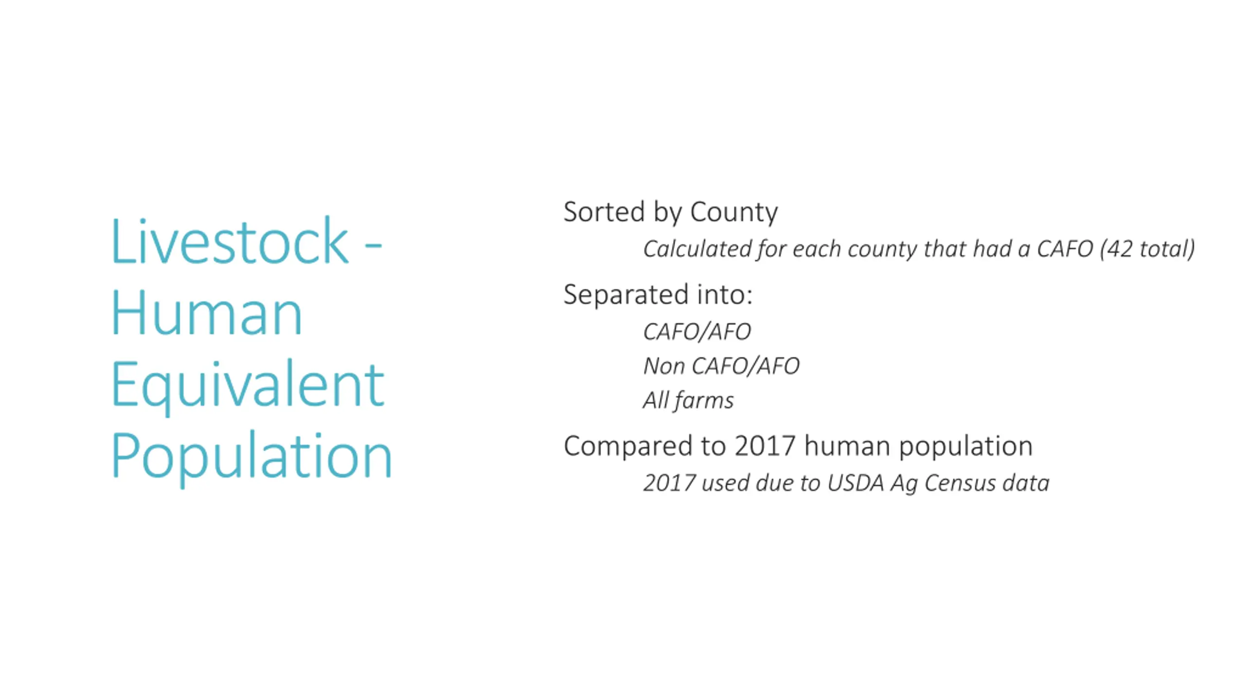 Sorted by County Calculated for each county that had a CAFO (42 total) Livestock - Human Equivalent Population Separated into: CAFO/AFO Non CAFO/AFO All farms Compared to 2017 human population 2017 used due to USDA Ag Census data